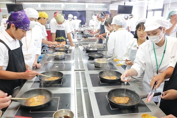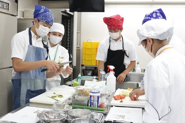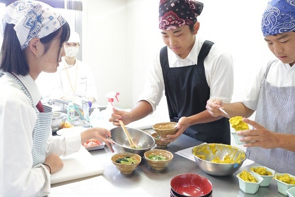 初めて調理をする高校生も多く、学生が一から丁寧に教えています。管理栄養士科、栄養士科の1年生も多く、緊張していたようでしたが、入学後3か月間で学んだことを生かして、一生懸命レクチャーしました。