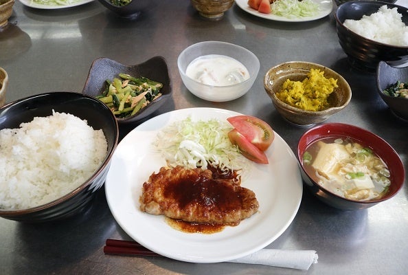 主食:ごはん 主菜:トンテキ 副菜:小松菜とツナの和え物、南瓜サラダ
