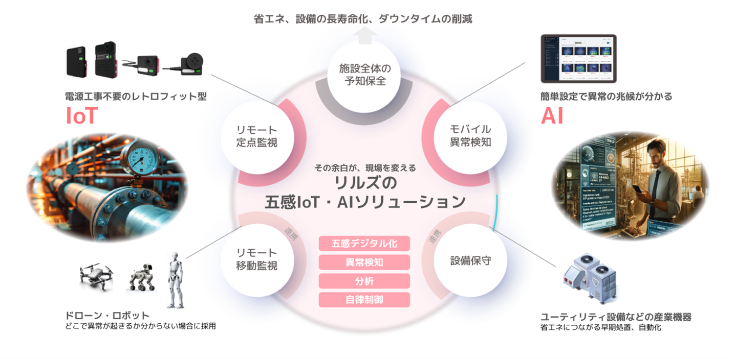 リルズが提供するリモート点検IoT・AIソリューションは、電源や通信環境が乏しい現場にも設置可能な低消費電力IoTカメラと、取得データを自動解析するAIクラウドソフトを組み合わせることで、計器の遠隔自動点検や設備の異常検知など、巡回点検業務のリモート化・省人化を実現しています。今後は、目視点検のリモート化にとどまらず、聴覚・嗅覚・触覚の情報も活用できる五感対応IoTカメラや現場のニーズに合わせた分析やレポート作成の自動化が可能な、プライベートAIエージェントの提供に向け、研究開発を進めています。