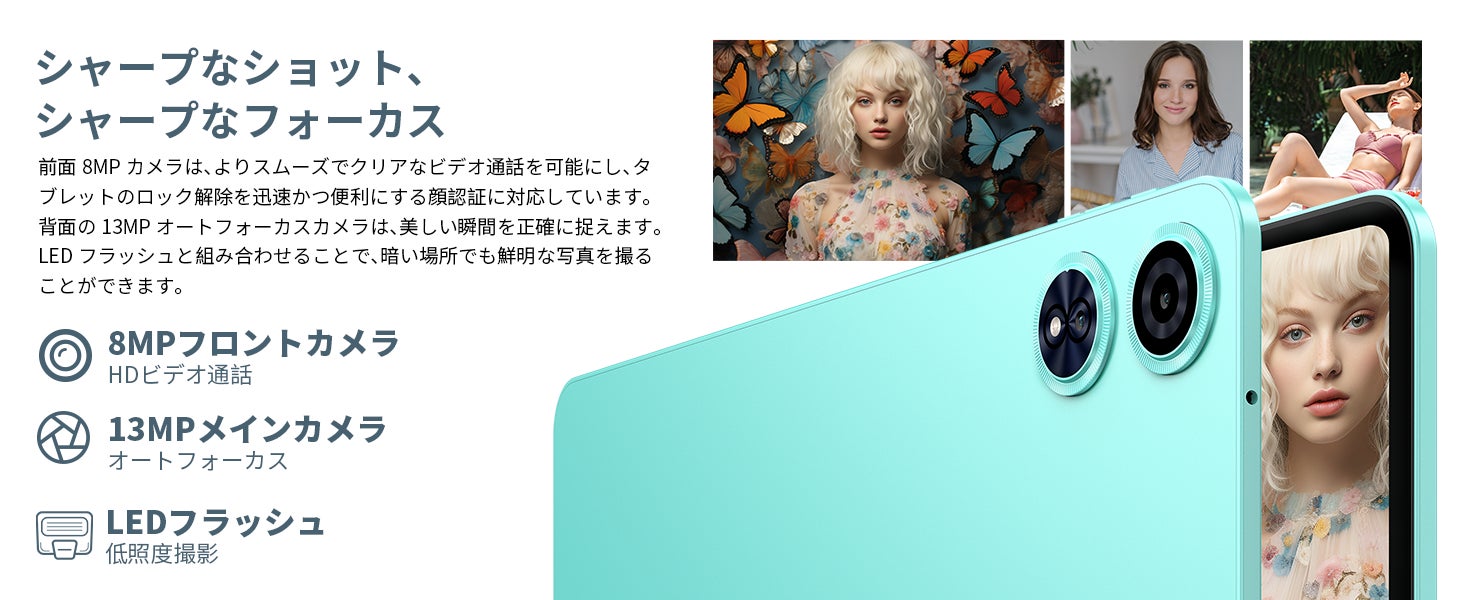 前面8MPカメラは、よりスム一ズでクリアなビデオ通話を可能にし、タプレットのロック解除を迅速かつ便利にする顔認証に対応しています。背面の13MP才一トフオ一カスカメラは、美しい瞬間を正確に捉えます。LEDフラッシュと組み合わせることで、暗い場所でも鲜明な写真を撮ることができます