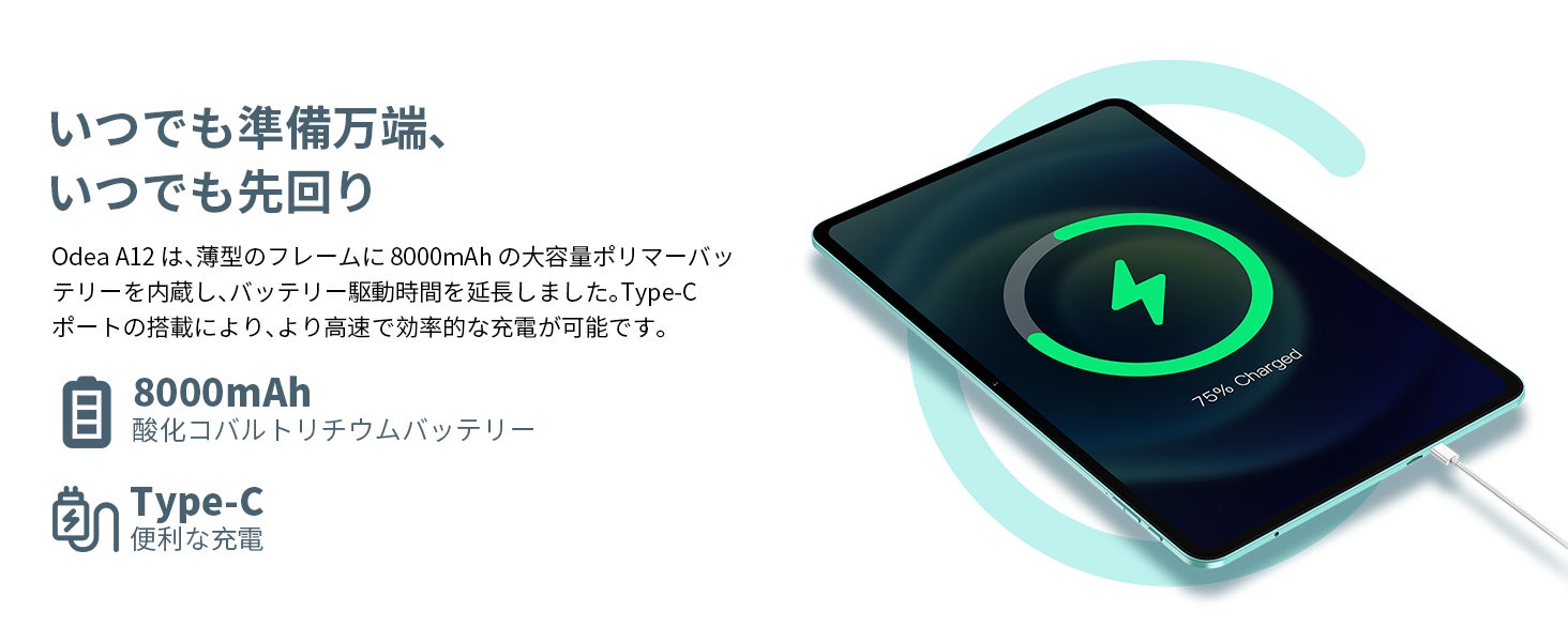 薄型のフレ一ムに8000mAhの大容量ポリマ一バッテリ一を内蔵し、バッテリ一駆動時間を延長しました。Type-Cポ一トの搭載により、より高速で効率的な充電が可能です。