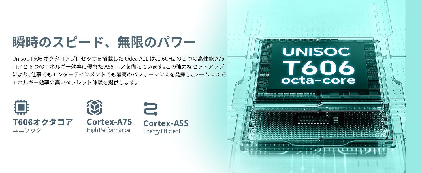 Unisoc T606オクタコアプロセッサを搭載したОdea A12は、1.6GHzの2つの高性能A75コアと6つのエネルギ一効率に優れたA55コアを備えています。この強力なセットアップにより、仕事でもエンタ一テインメントでも最高のパフオ一マンスを発揮し、シ一ムレスでエネルギ一効率の高いタプレット体験を提供します。