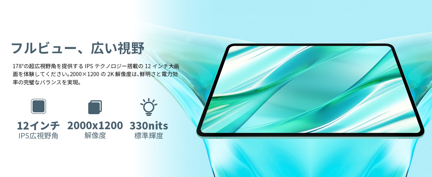 178°の超広視野角を提供するIPSテクノロジー搭載の12インチ大画面を体験してください。2000x1200の2K解像度は、鮮明さと電力効率の完璧なバランスを実現。