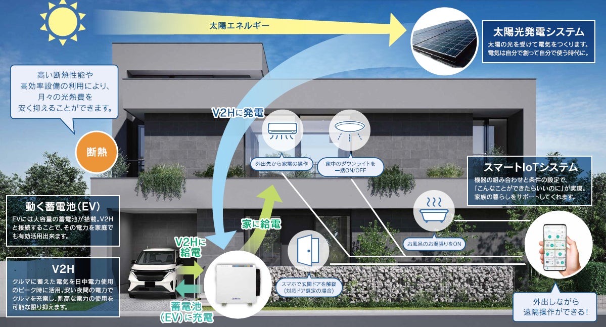 株式会社ヤマダホームズ(本社︓群⾺県⾼崎市、代表取締役兼社⻑執⾏役員︓清村浩⼀)は、この度、ヤマダホールディングス 50 周年記念商品として、動く蓄電池(EV)を標準搭載し、太陽光発電システム、V2H、IoTを使って「創エネ・畜エネ・省エネ」を実現する近未来スタンダード住宅「YAMADA スマートハウス」を、2023年10 ⽉14⽇(⼟)より販売開始いたします。