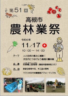 このイベントは、野菜の販売などを通して市内農産物のPRをすることで、来場者に農林業を身近に感じてもらうことを目的に市、同市農業委員会、JAたかつき、大阪府森林組合などの6団体によって例年開催しています。当日は、市内農家が丹精して育てた市特産品の三箇牧トマトや服部シロウリのほか、白菜、ダイコン、ゆず、カボチャなどの冬野菜や市内竹林の間伐材で作られた木工品を販売。さらに、会場内での買い物でスタンプを集めると参加できる農産物福引抽選会、マスのつかみ取り、木を掴んで切断を行う林業機械のパフォーマンス、本市の農林産物を利用した飲食物の販売などもあって、ご家族でお楽しみいただける内容が盛りだくさん。全部で50を超えるブースが並び、市内農林業の魅力がたっぷり詰まったイベントです。今回からは、参加していただきやすい開催時間に変更しています。ぜひお越しください。