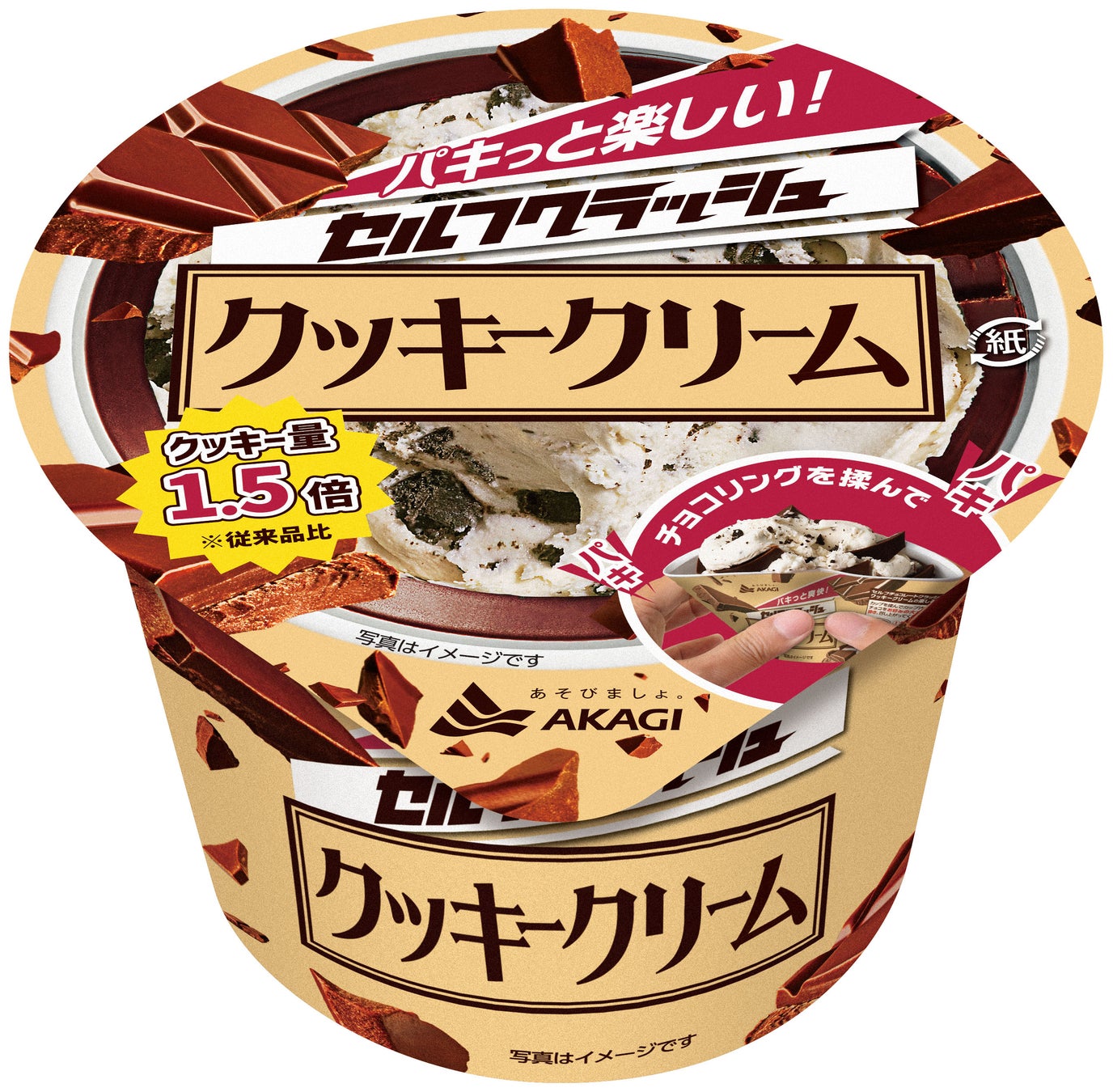 「セルフクラッシュ」は、容器側面をパリパリのチョコでコーティングし、自分でチョコを砕いて好みのサイズで楽しめるカップアイスです。軽く揉めば、大きめのパキッとしたチョコの食感を、しっかり揉めば細かいパリパリチョコを贅沢に味わえます。砕くときの感触や音も爽快で、その日の気分に合わせて、自分好みの砕き方で楽しく味わってください。