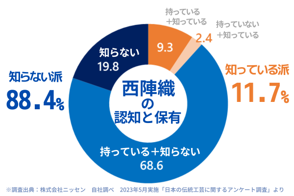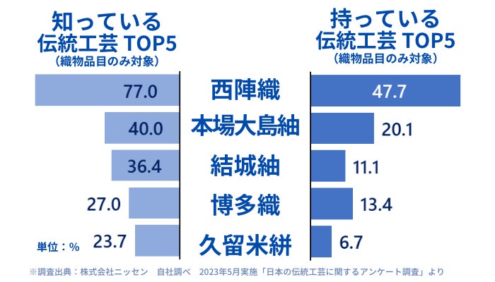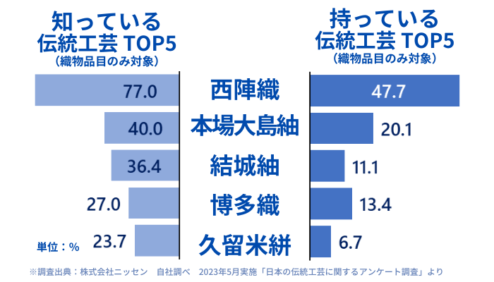 経済産業大臣の指定を受けている工芸品は240品目(2022年11月現在)。その中の「織物」に分類されている38の工芸品について、認知度と保有を質問したところ、いずれも「西陣織」が1位という結果になりました。