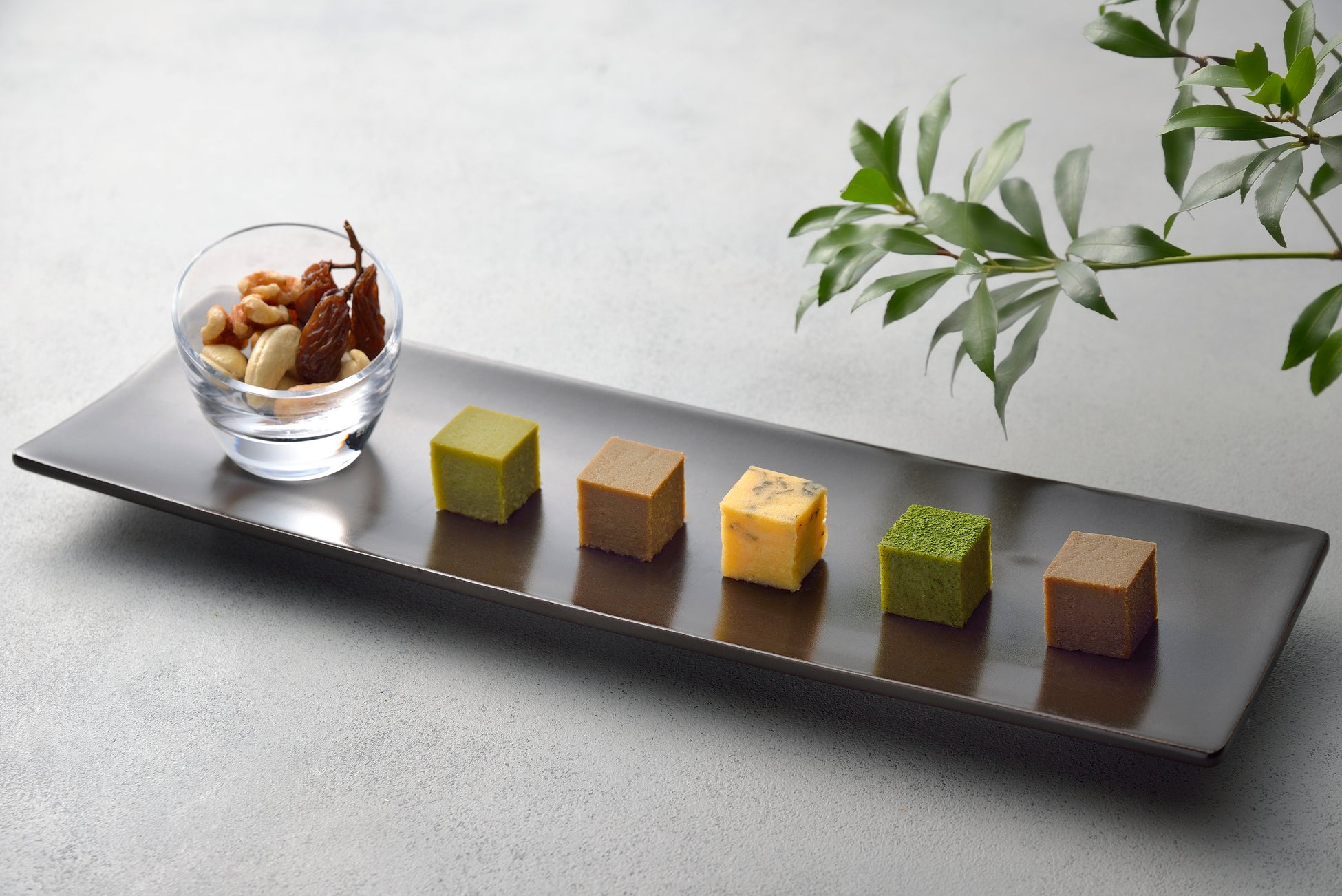 5種類(玉露、京番茶、かぶせ茶、焙煎抹茶、ほうじ茶)の、それぞれ異なる宇治茶の味わいをお楽しみいただけるあんショコラ。横に添えたナッツやレーズン、ゆずピールをお好みで合わせ、お酒のお供にお召し上がりください。