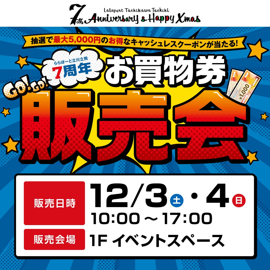 「ららぽーと立川立飛 7th Anniversary & Happy Xmas」は、クーポン券が当たるお買物券販売会や、ららぽーと共通お買物・お食事券や豪華景品が当たる抽選会などおトクなキャンペーンを実施します。さらに7周年をお祝いするクリスマスオブジェが登場いたします!ぜひこの機会にららぽーと立川立飛へお越しください。