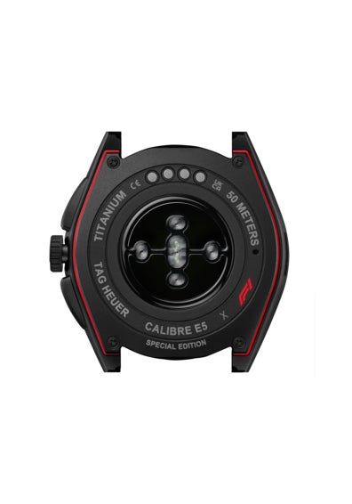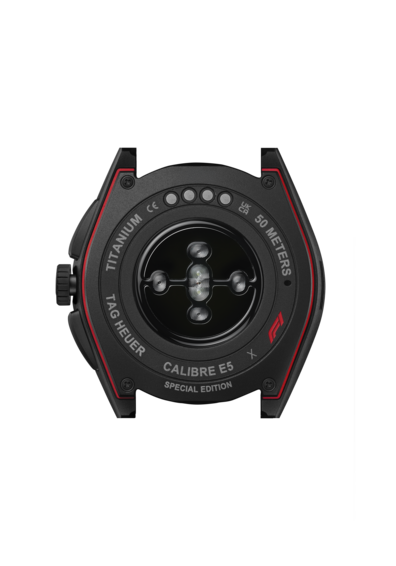 あらゆるディテールにF1® の真髄を注ぎ込んだ TAG Heuer Connected Calibre E5 45 mm x Formula 1®。サテン仕上げとサンドブラスト加工を施したグレード2チタン製ケースにはブラックDLCコーティングが採用され、カーブを描くタッチスクリーンベゼルに沿ってグランプリ™ ウィークエンドの各セッションが表示されます。また、ブラックDLCコーティングを施し、レッドラッカーのアクセントを効かせた一体型プッシュボタン、ブラックラバーで縁取られたブラックDLCコーティングのステンレススティール製のリューズが、モーターレーシングのエッセンスをさりげなく添えています。ケースバックには、心拍数センサーと赤のF1® ロゴを配し、このコラボレーションウォッチのハイオクタンなアイデンティティを鮮やかに際立たせています。