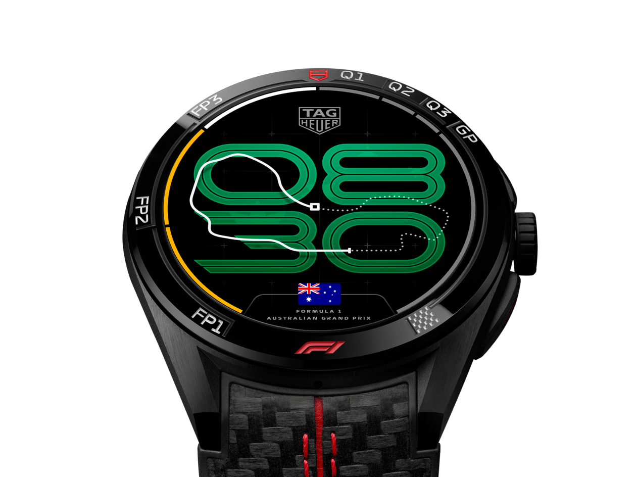 システムのあらゆる要素が、没入感あふれる究極のF1® 体験が楽しめるよう開発され、カスタムサウンドや各種ブランドアイコンが随所に配され、さりげなくモーターレーシングのエッセンスを添えます。例えば、チーム無線のやり取りを模した通知機能が、すべてのアラートをまるでピットウォールから直接送られてきた指示であるかのように感じさせ、このコネクテッドウォッチを身に着ける方を自分ならではのレースストーリーを紡ぐF1® ドライバーへと変身させます。さらに、アニメーション化されたベゼルマーキングと円形コンプリケーションが、レースウィークエンドの各セッションを表示。これによってフリー走行のFP1、FP2、FP3から予選のQ1、Q2、Q3、さらに決勝レースのGPまでの状況を一目で把握できます。