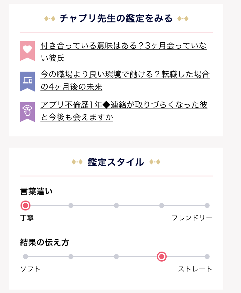 言葉遣いや結果の伝え方といった鑑定スタイルの特徴を可視化する表や、『Chapli』での実際の鑑定内容など、生の声を掲載しています。