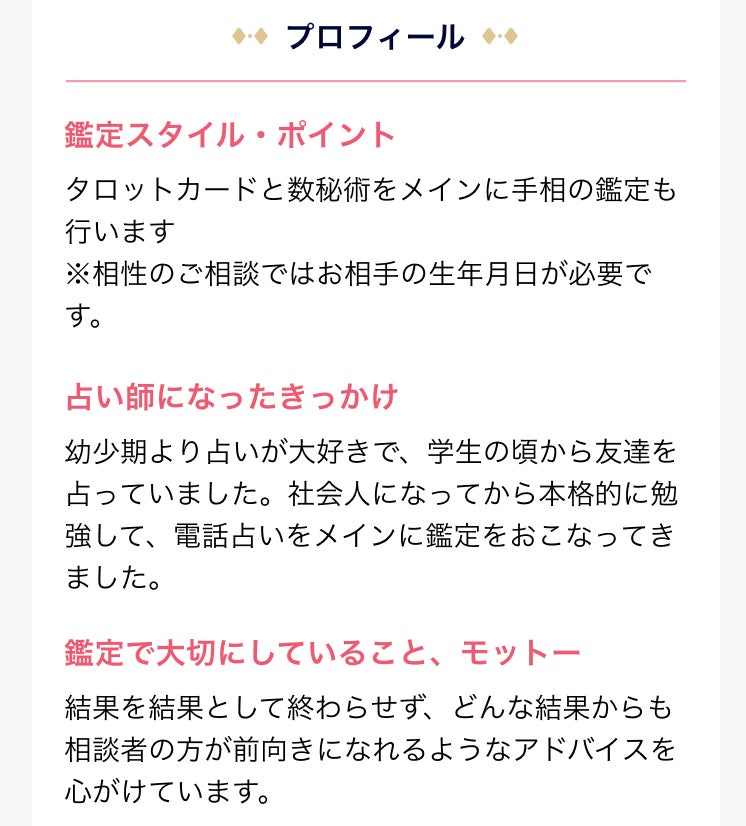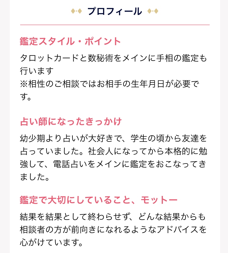 占い師になったきっかけや、鑑定で大切にしているモットー、お客様へのメッセージなど、より個性や想いを伝えることができる項目も掲載可能です。