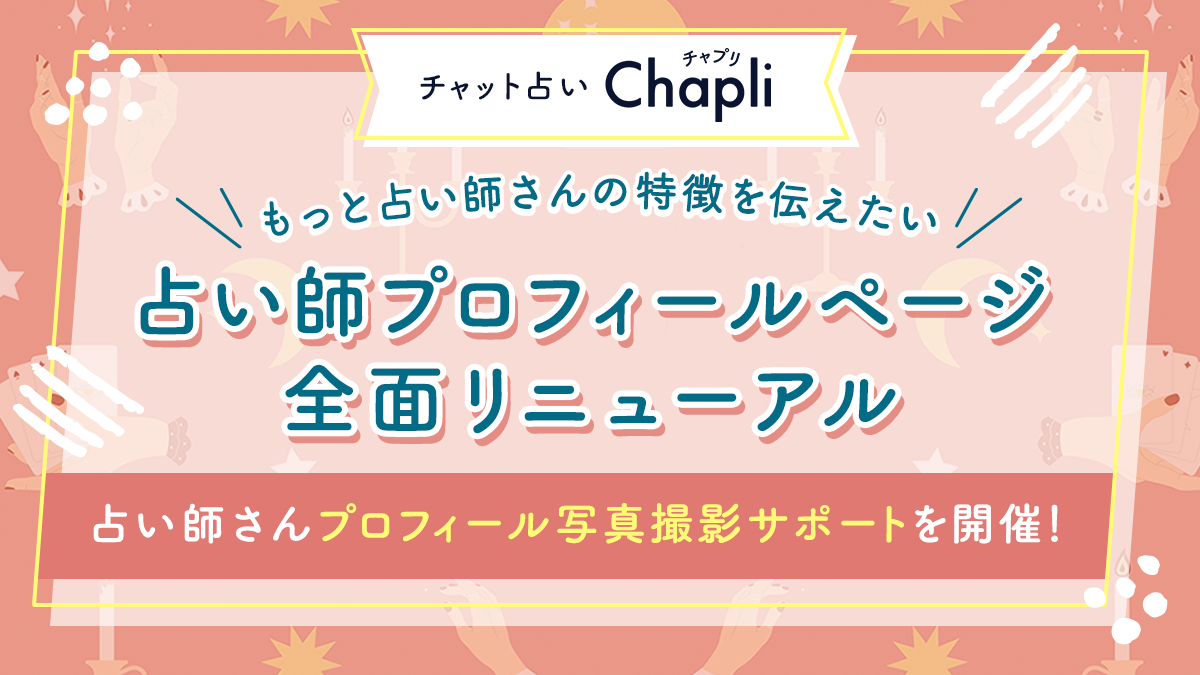 今回、それらの特徴をより一層詳しくお客様にお伝えするために、個々の雰囲気や鑑定の特徴を感じられるコンテンツを増やすなどのリニューアルをおこなうに至りました。今後も『Chapli』は、プロフィール内容のブラッシュアップやお客様ニーズの分析などを強化し、占い師さんのサポートに尽力してまいります。※リニューアルはアプリのみで実施。