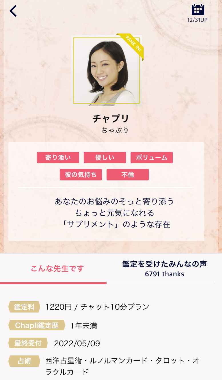 新しいバージョンの占い師プロフィールページを見て鑑定をご利用された方の中から、抽選で10名様に『Chapli』のチャット鑑定が50%オフになるクーポンをプレゼントいたします。