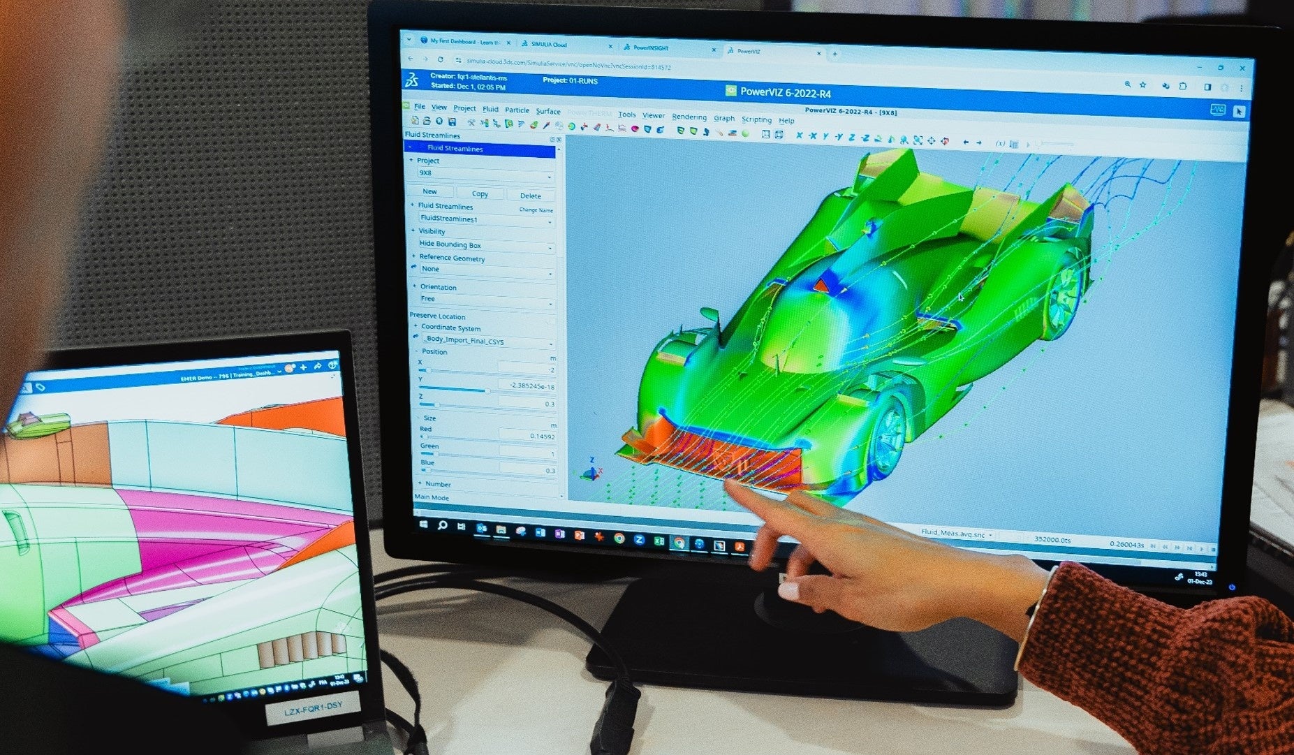 このハイパーカーの外装全体のバーチャルツインを作成し、車の性能や発生するダウンフォース(車体を路面に押し付けるように影響する力)や安定性等に対して、設計がもたらす空力効果を精確に予測するために、ダッソー・システムズのSIMULIA PowerFLOWアプリケーションが使用されました。同アプリケーションにより、プジョー・スポールはクラウド上における設計とシミュレーション間のシームレスなデータ連携を通じて、設計案を評価し、最適化することができました。その結果、さらに効率的かつ費用対効果の高い方法で、最終的な設計に関する意思決定が行われました。