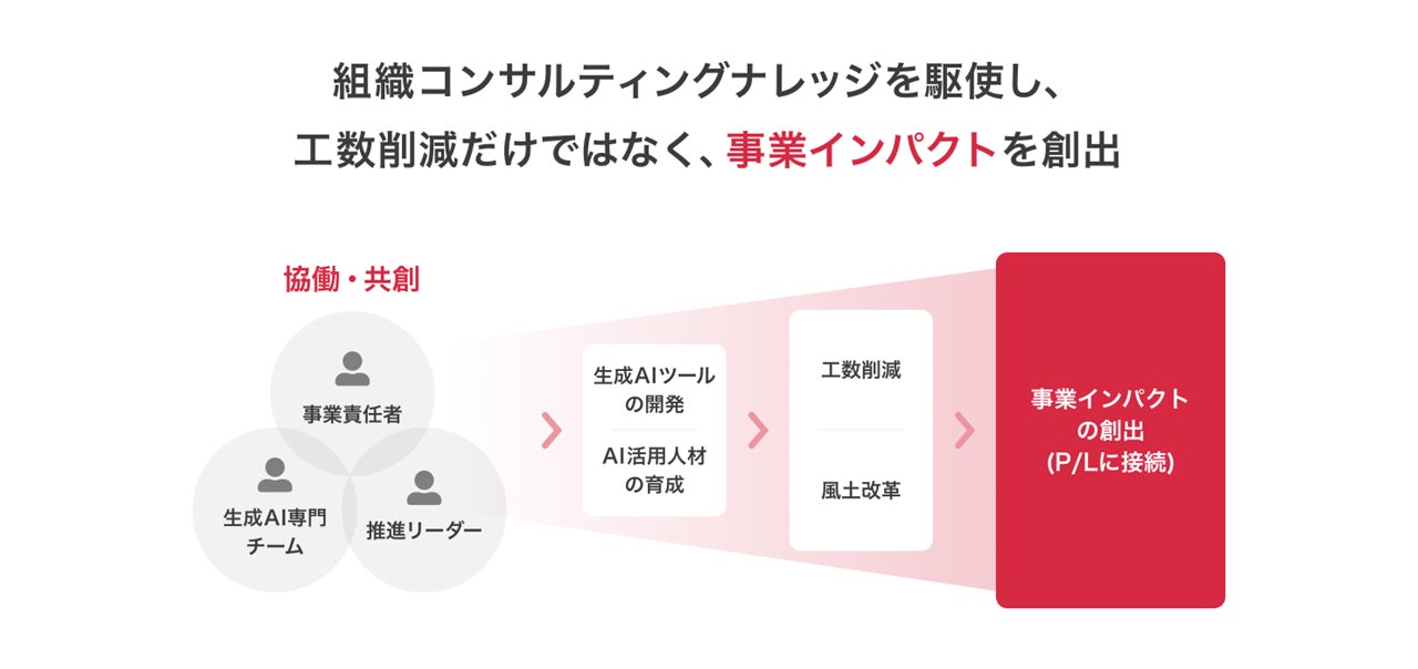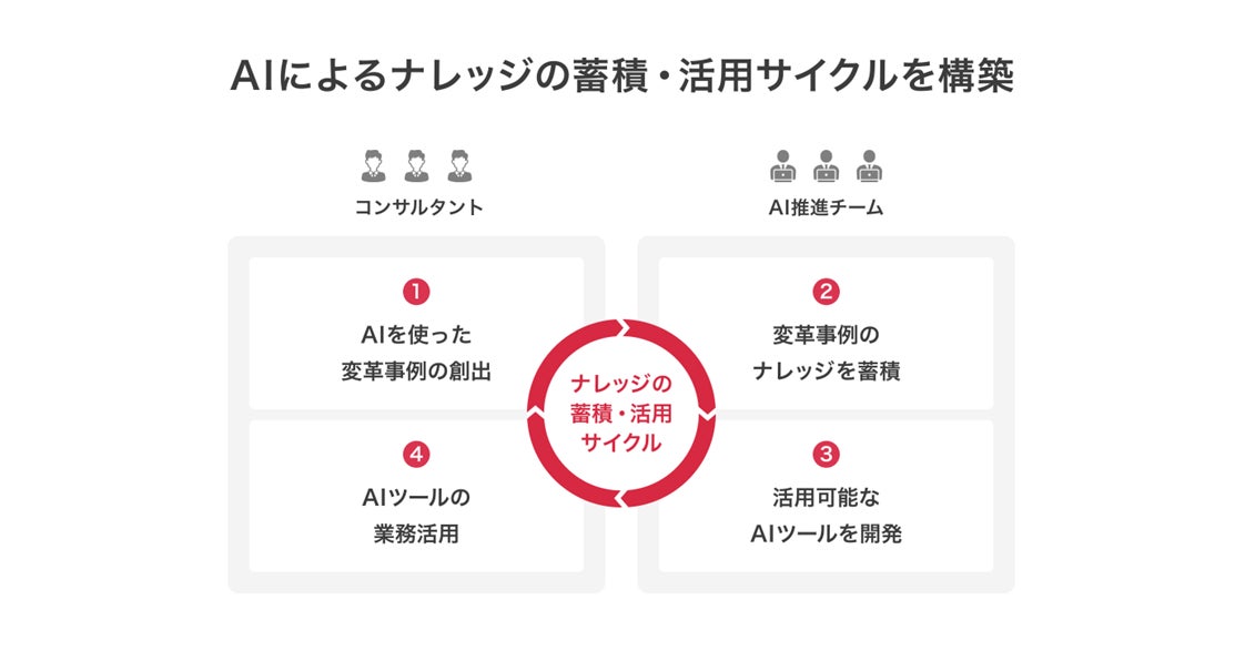 まず、生成AI推進チームを立ち上げ、コンサルティング専門部隊と協働しながら、AIツールの開発、活用、変革事例創出、ナレッジの蓄積というサイクルを構築しました。また、現場レイヤーでツール制作を行う人材と、業務全体を理解して活用インパクトを見極められる人材を分けて配置することで、本質的な事業インパクトの創出を目指しました。