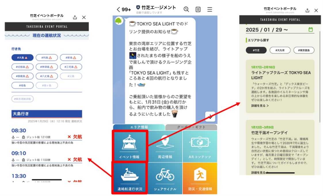 大丸有地区など周辺地域のイベント情報や、島しょ部への定期船の運航状況などを竹芝公式LINEに集約することで、周辺エリアも含めた相互的な回遊性向上を図ります。なお、大丸有エリアの都市OSと、竹芝のSmart City Platformが連携しているため、竹芝公式LINEで大丸有地区のリアルタイムのイベント情報などを確認することができます。