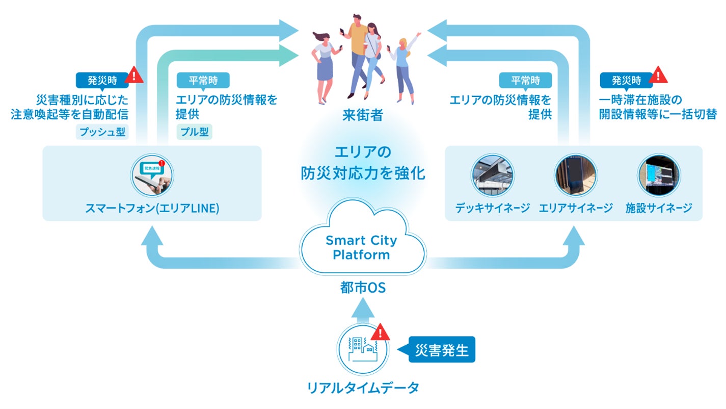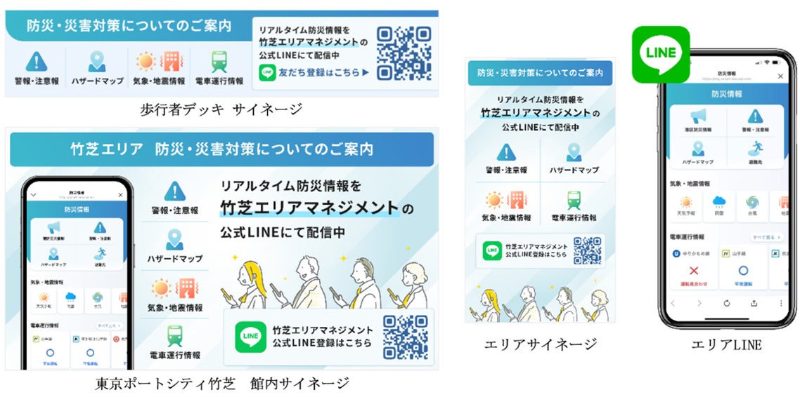 竹芝地区は、オフィスや商業施設、MICE(ビジネスイベント)施設、学校などに訪れる昼間人口が多いという特性があり、居住者に比べてエリア内の防災情報に精通していない方が多いことが推定され、災害時に来街者が迅速かつ適切に防災情報を取得できない可能性があります。一方で、災害発生時は約4万7000人※2もの帰宅困難者が発生すると想定されています。そこで、竹芝公式LINEを活用して、平常時には利用者が自ら取得できる方法(プル型)で防災情報を提供し、災害発災時には災害種別(地震発生や大雨・台風などの気象警報)に応じた注意喚起などを利用者に自動的に届ける方法(プッシュ型)で防災情報を提供できる仕組みや、発災時にエリア内の複数のサイネージを連携させて、一時滞在施設の開設情報などを配信する仕組みを構築しました。これにより、来街者に対して迅速かつ適切に防災情報を届けることが可能となり、エリアの防災力の強化を図っています。