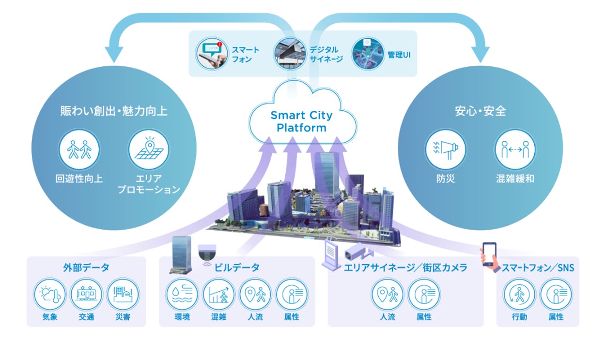 東急不動産とソフトバンクは、「スマートシティ竹芝」として、竹芝地区で収集した人流データ や訪問者の属性データ、道路状況、交通状況、水位などのデータをリアルタイムでさまざまな事業者が活用できるデータ流通プラットフォームや、先端技術を活用したサービスなどを竹芝地区に実装することで、回遊性の向上や混雑の緩和、防災の強化などを実現し、竹芝および周辺地区の課題を解決に向けて取り組むとともに、分野を横断したサービスによって、エリアの経済的発展と付加価値の創出を目指しています。