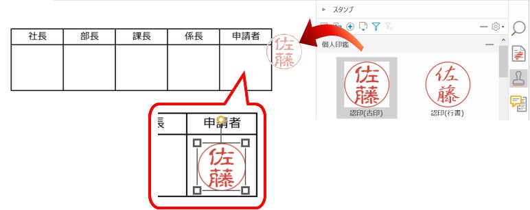 電子印鑑テンプレートの種類を追加し、作成できる印鑑の種類が増えました。サイズを指定して電子印鑑を作成できるため、今まで使っていたハンコと同じサイズで直感的に押印できます。電子印鑑と、改ざんを防ぐ電子署名用証明書(*1)の関連付けも可能になり、これまで「紙・ハンコ」で行っていた業務を「PDF・電子印鑑」へスムーズに置き換えます。