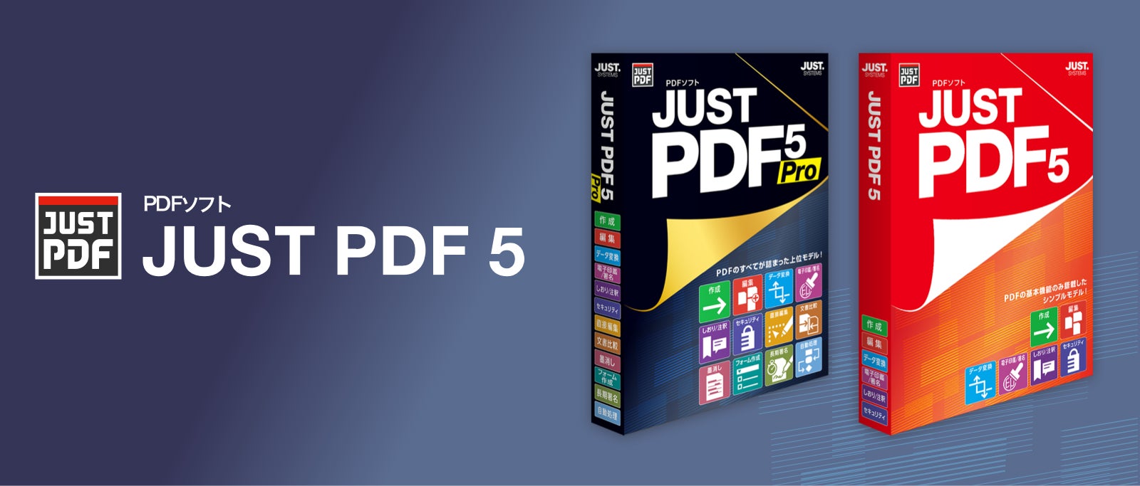 「JUST PDF 5 Pro」は、PDFの[作成]・[データ変換]に加え、PDFの統合や入れ替えといった基本的な編集から、PDF内の文字や画像の直接編集など、高度な機能が特徴の[編集Pro]を搭載したプロフェッショナルモデルです。「JUST PDF 5」は[作成]・[編集]・[データ変換]の基本機能を搭載したモデルで、目的や用途に応じて2ラインナップからお選びいただけます。