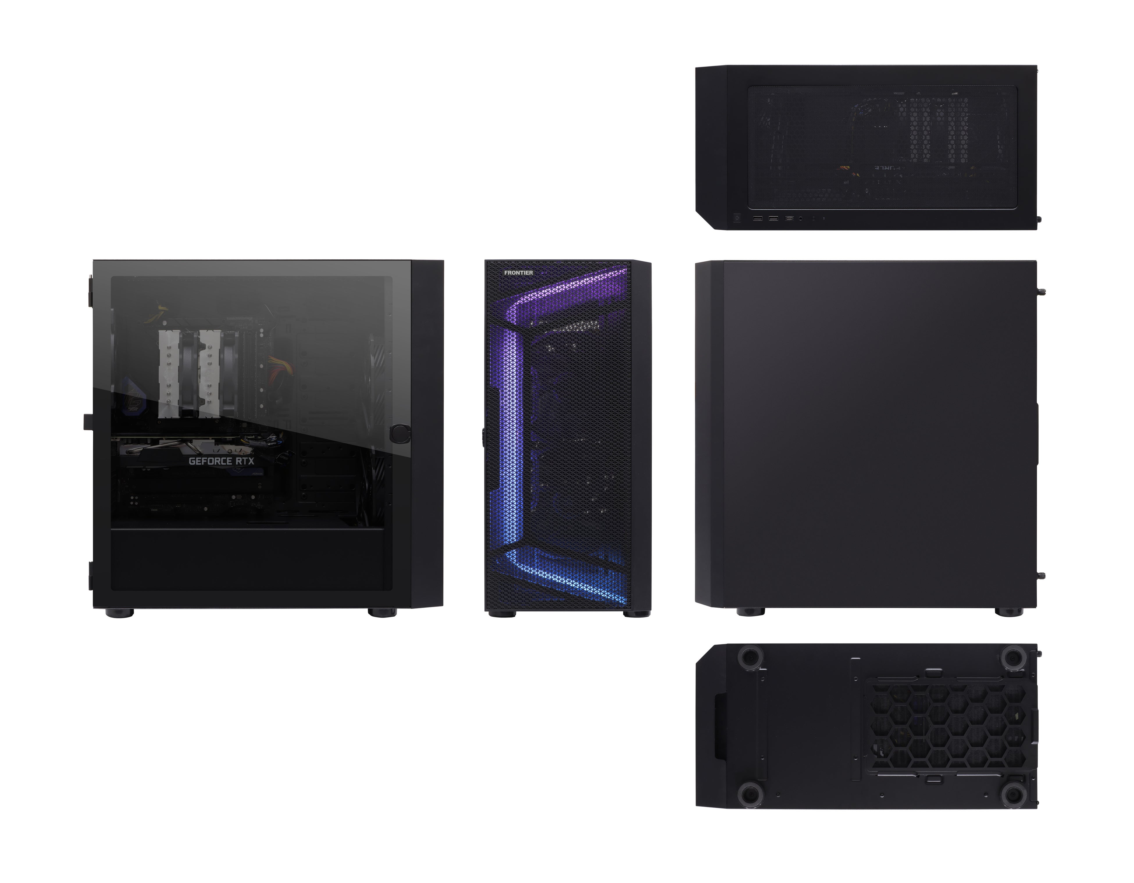 GBシリーズは、ARGBライトストリップ内蔵のフロントメッシュパネルとガラスサイドパネルを採用したきらめく外観のケースを採用しています。前面に搭載した2つの160㎜大型ファンのパワフルな吸気で通気性を底上げし、効率的なエアフローを実現しました。