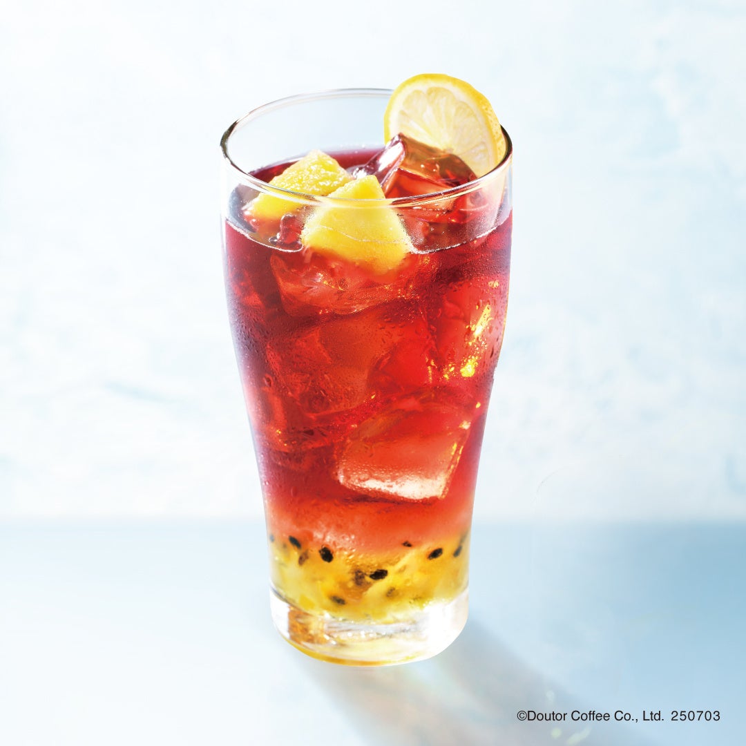 鮮やかなルビーレッドの美しい色合いと爽やかな酸味が魅力のローズヒップ&ハイビスカスティーに、もちもち食感のナタデココとパッションフルーツの種も入ったソースを合わせたトロピカルフルーツティーです。