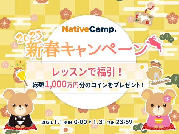 ネイティブスピーカーと回数無制限のオンライン英会話サービス「ネイティブキャンプ英会話」を展開する株式会社ネイティブキャンプ(東京都渋谷区 代表取締役:谷川国洋)は「2023新春キャンペーン」を開催、レッスン受講者に総額1,000万円分のコインをプレゼントいたします。