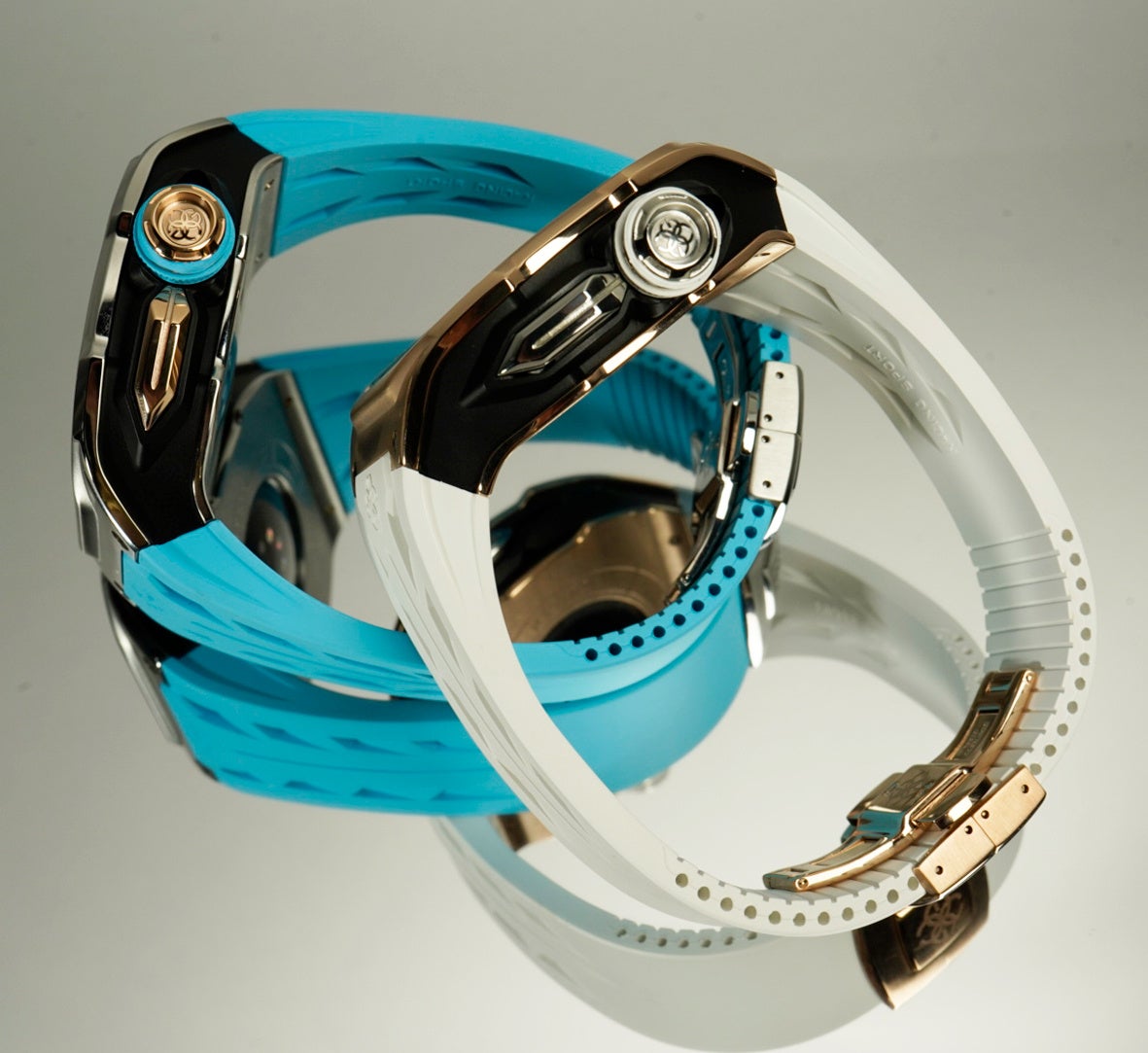 最大の特徴は、ベゼル、サイドボタン、リューズといったアクセントパーツが、シルバーとローズゴールドのコンビカラーとなっており、その配色バランスが絶妙であることでモデル全体の美しさが際立ちます。