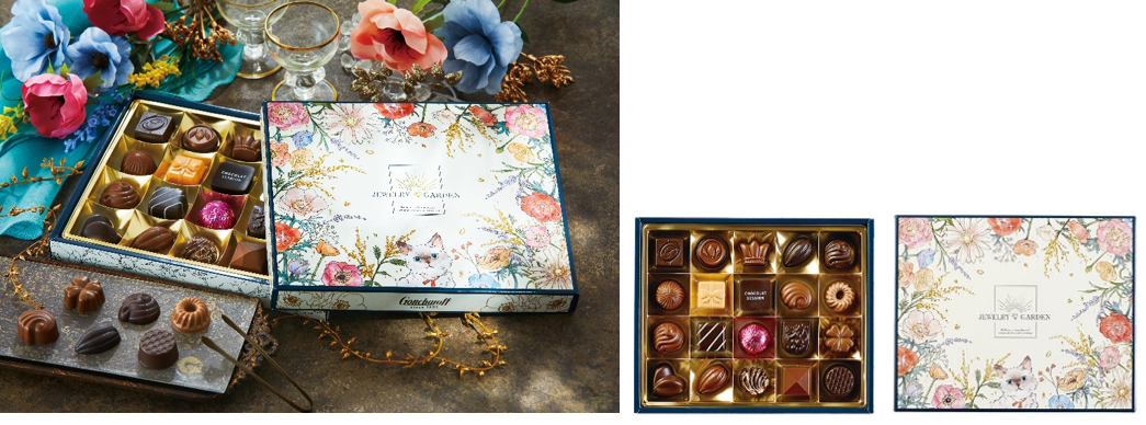 ■特長:アーモンドや宇治抹茶などのガナッシュが入った、20種類のバラエティー豊かなチョコレート。味・見た目ともにすべて異なる内容になっているため、飽きずに最後までお楽しみいただけます。きらきら光るお庭と、かわいい猫のモチーフが描かれたオリジナルパッケージは、大切な人に贈るプレゼントにぴったりの華やかな商品です。
