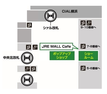 JRE MALLで販売している商品を実際に「見て・触れて・味わうことができる」体験型のショールーム店舗です。2週間に1回変わるテーマに合わせた様々な商品を展示しています。店内に併設のカフェでは、ベックスコーヒーショップのコーヒーを味わうことができるほか、JRE MALLの商品やJRE MALLふるさと納税の返礼品を味わうことができます。また、店舗前のコンコースPOP UP SHOPでは、店舗内のテーマに連動した旬の商品を購入することができます。