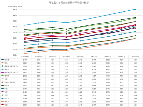 地域ごとの年間支給総額の平均は下表のように推移しており、令和3年以降はすべての地域で継続的に上昇していることが見て取れます。