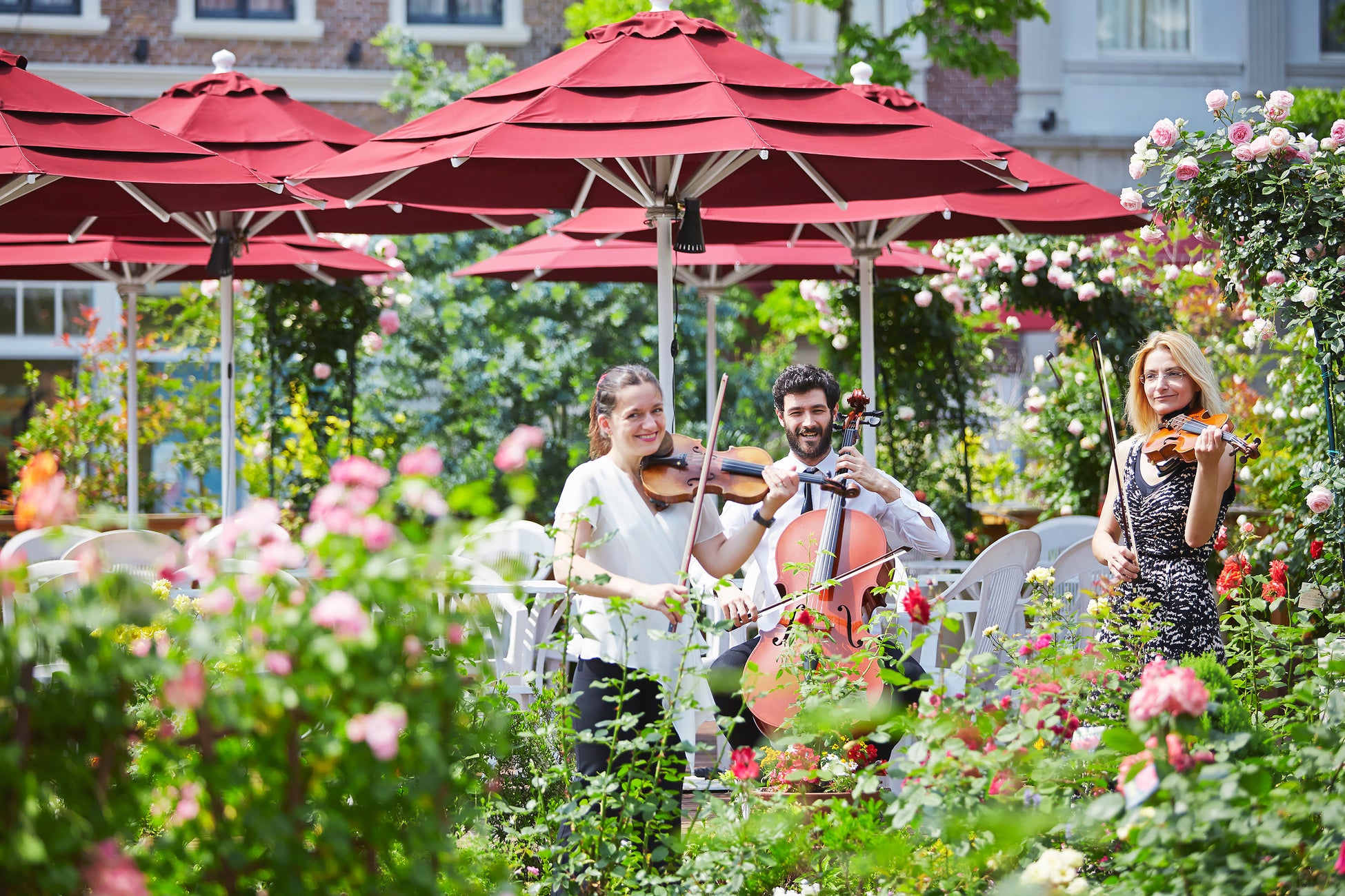 バラの中でバイオリン等の生演奏を聴きながらワインと優雅な時間を