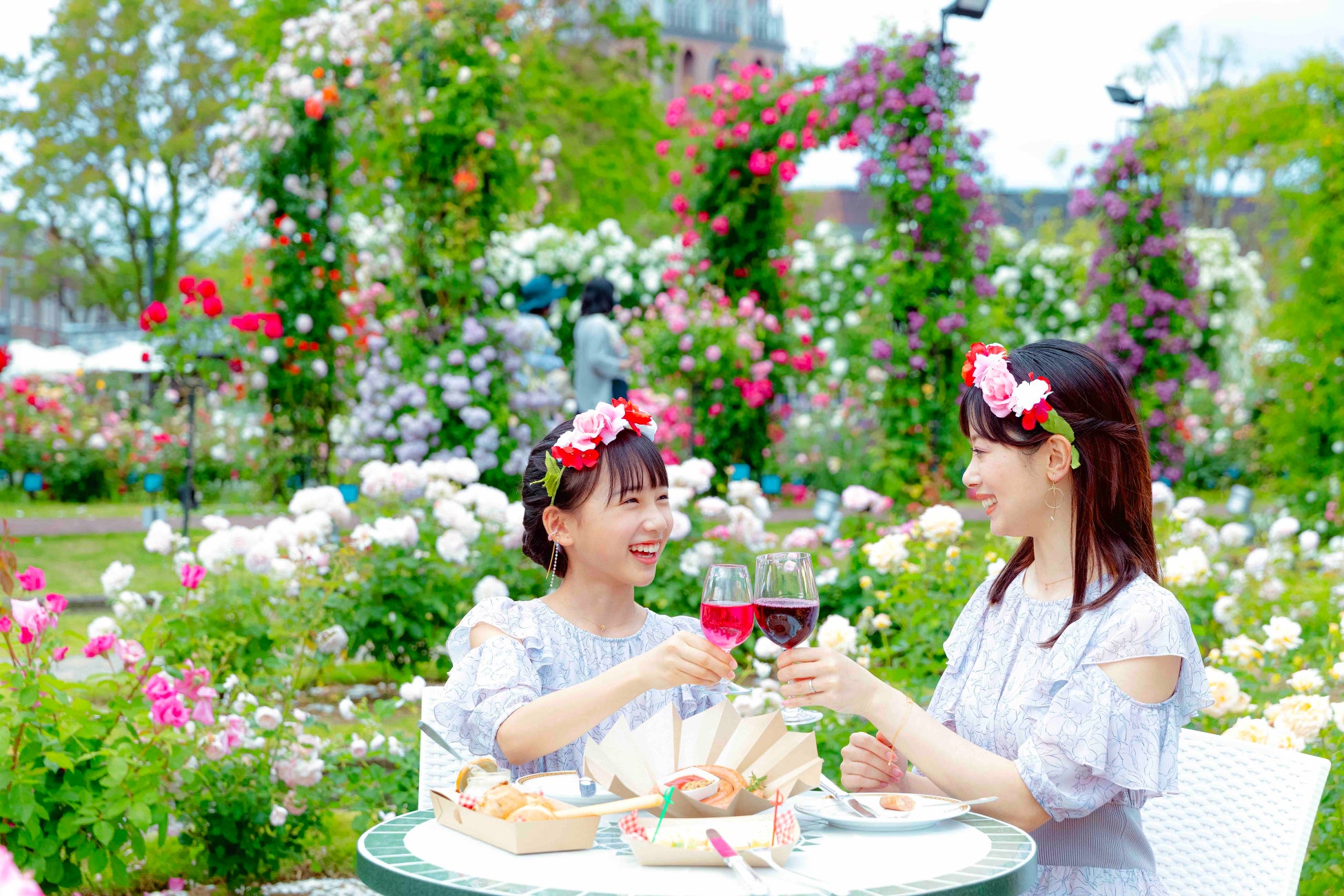 バラ祭の期間限定で「初夏のワイン祭」も開催。イタリアやフランスなどから取り寄せた25種類のボトルワインや5種類の樽生ワインが楽しめます。またアルコールの苦手な方向けのノンアルコールやソフトドリンクもご用意し、どの世代の方もバラ園の中で優雅なひと時を過ごす事が出来ます。今年はバイオリンなどの生演奏も登場。よりラグジュアリーな空間の中で、バラの香りを感じながらワインを楽しんでみてはいかが?