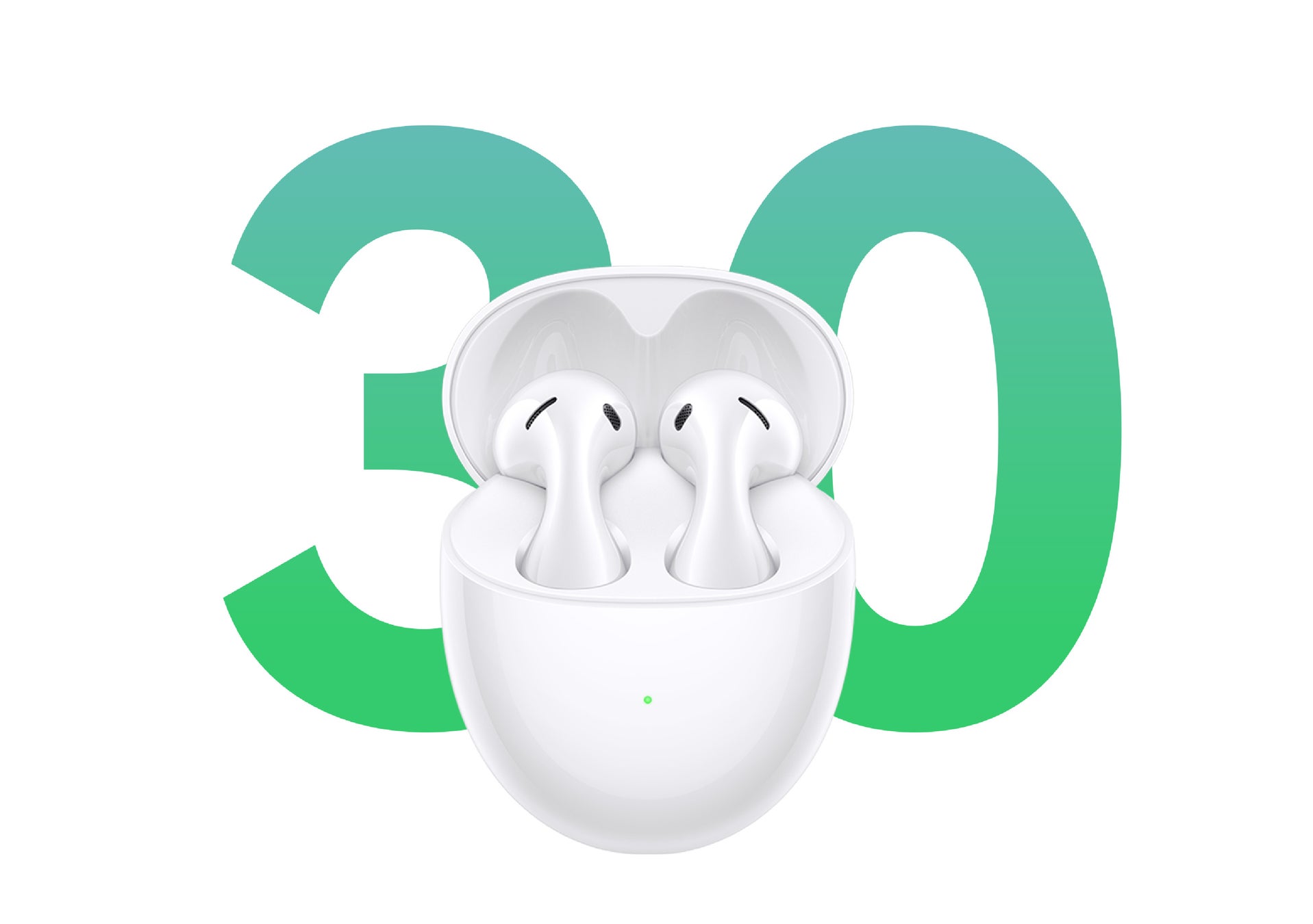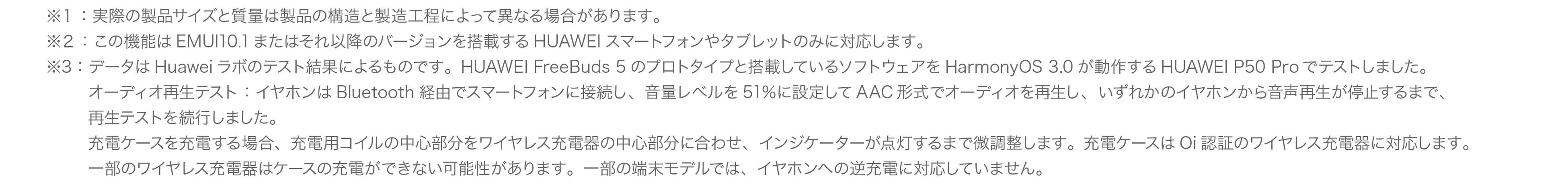 ※4 バッテリー駆動時間データはファーウェイラボのテスト結果によるものです。ANCを無効にした状態でイヤホン本体を5分間充電した場合、約2時間の音楽再生が可能です。またANCを無効にした状態で充電ケースと組み合わせると最大約30時間の音楽再生が可能となります。実際の使用状況によりバッテリー駆動時間は異なる場合があります。