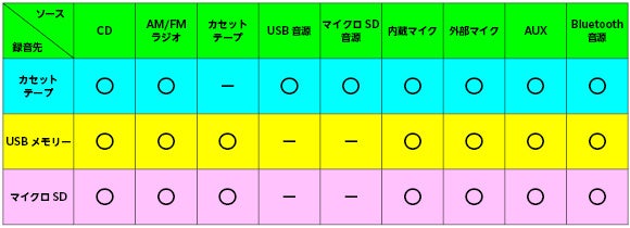 ・カセットテープへの録音可能ソース:CD/ラジオ/BT接続/USB/microSD/AUX(有線)/内蔵マイク/外部マイク入力