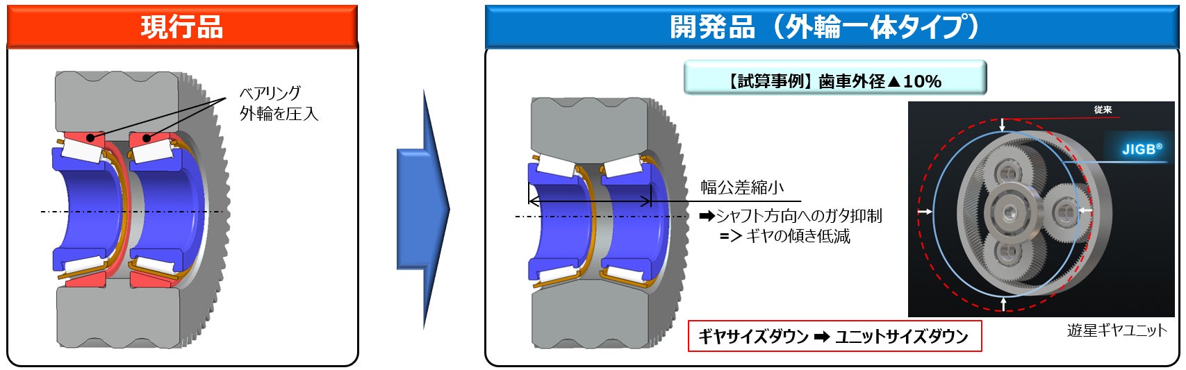 ギヤの内部にベアリングを組付ける場合、組付け時のガタにより、ギヤ全体の強度が低下する可能性があります。これに対し開発品では、ギヤ内径をベアリングの外輪とすることにより、ギヤの傾きを低減し、ギヤサイズ及び、搭載されるユニットのサイズダウンを実現。またギヤ内径へのベアリング圧入工程の省略による部品点数の削減も見込めます。