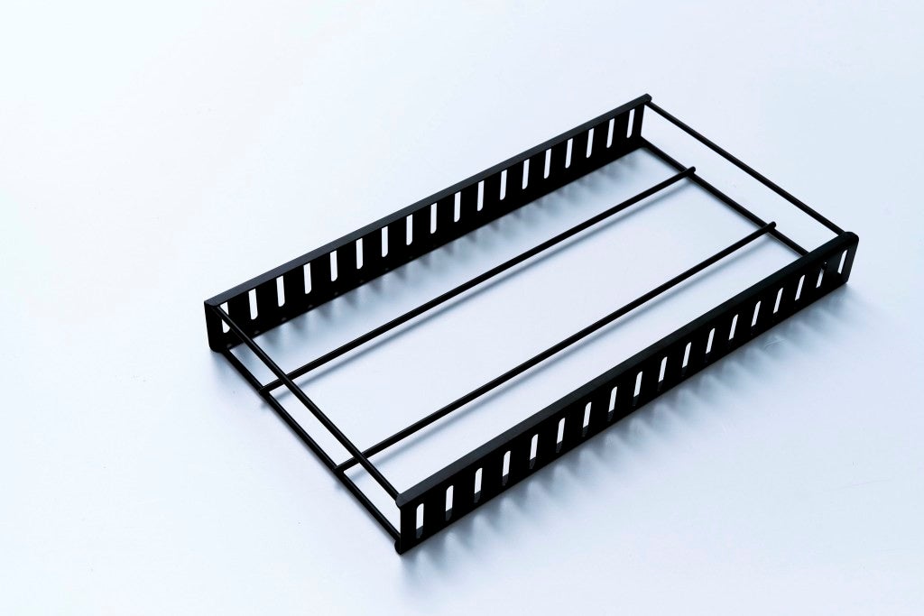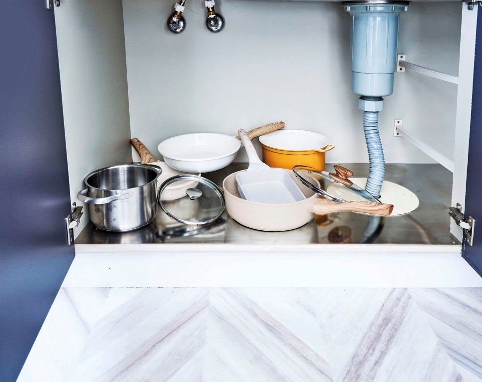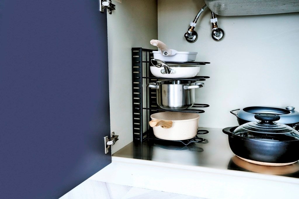 仕切りの間隔は、収納するアイテムに合わせて調整可能。大小さまざまなフライパンはもちろん、フタや調理器具も安定して置ける曲線デザイン。滑り止め付きなので、出し入れの際もズレにくく安心です。