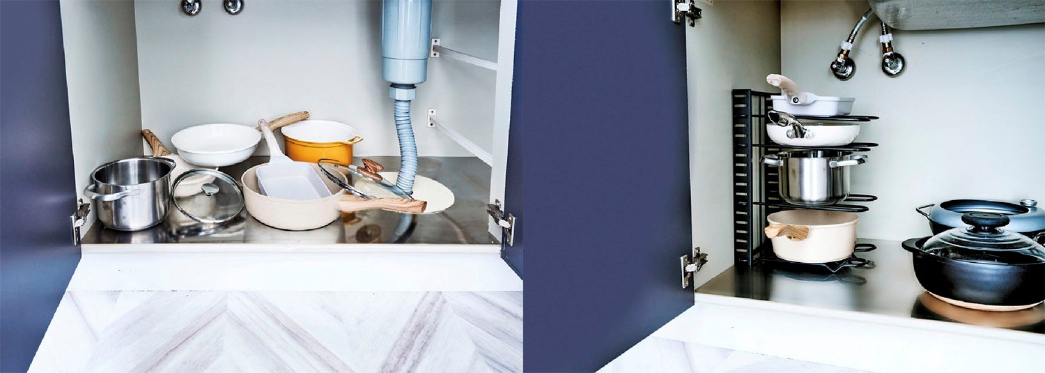 両側でしっかり支える1WAY(両側使用)は、フライパンや鍋をまとめて収納したいときに。
