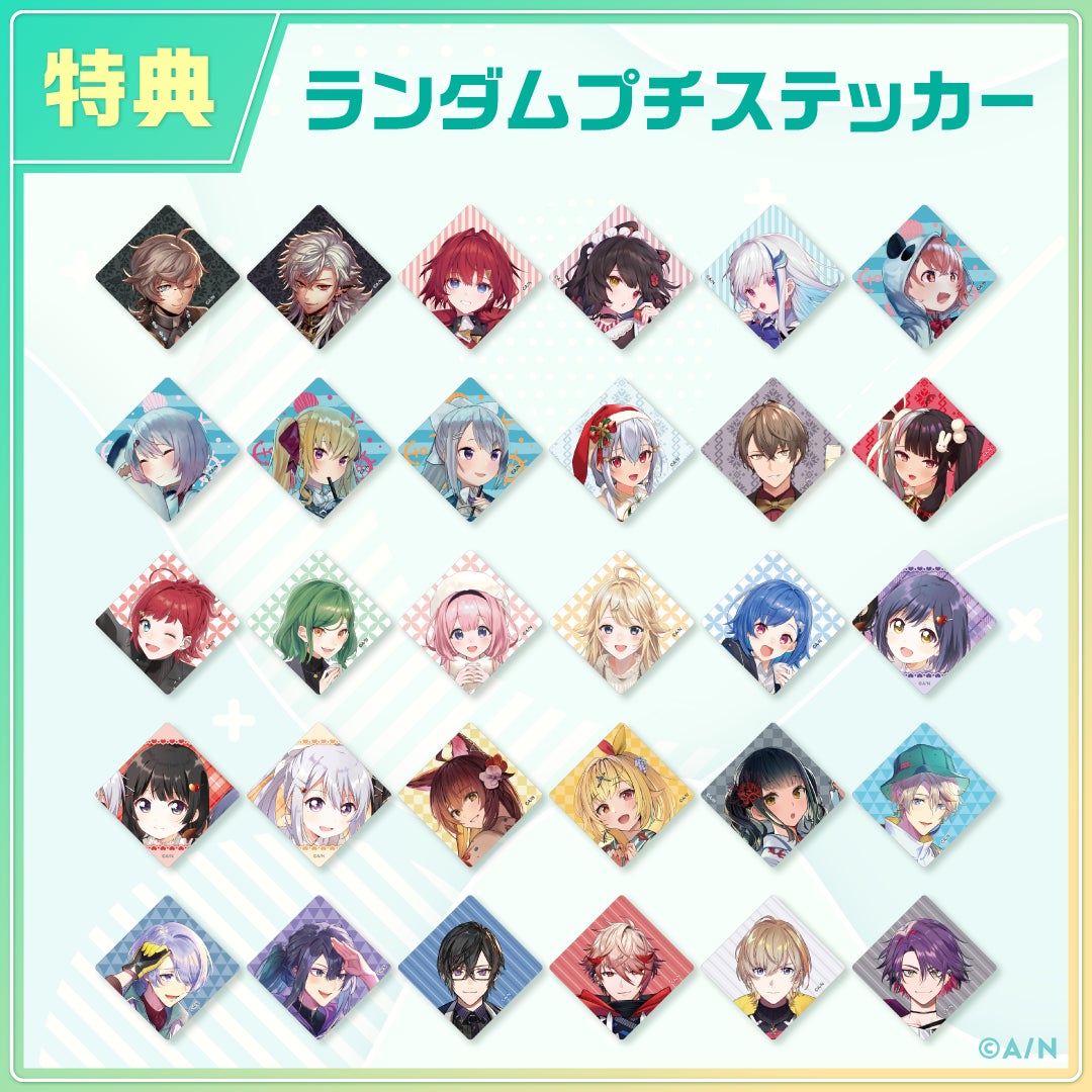 ・種類:全30種(静凛、月ノ美兎、樋口楓、叶、葛葉、戌亥とこ、アンジュ・カトリーナ、リゼ・ヘルエスタ、笹木咲、椎名唯華、鷹宮リオン、葉加瀬冬雪、夜見れな、加賀美ハヤト、朝日南アカネ、北小路ヒスイ、周央サンゴ、東堂コハク、西園チグサ、フミ、星川サラ、山神カルタ、甲斐田晴、弦月藤士郎、長尾景、風楽奏斗、渡会雲雀、四季凪アキラ、セラフ・ダズルガーデン)