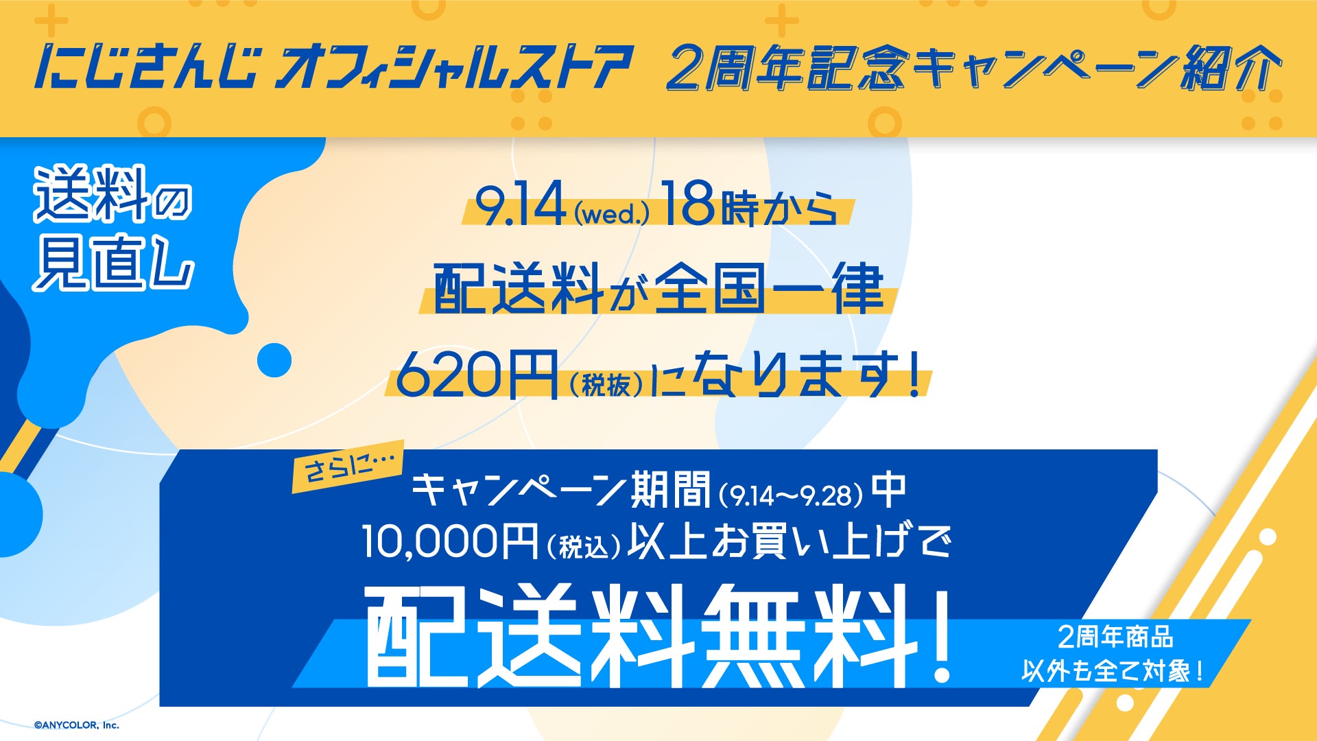 2022年9月14日(水)18時から配送料改定(値下げ)、にじさんじオフィシャルストア商品10,000円(税込)以上のご購入で配送料無料、対象商品ご購入でプチステッカーの特典つき