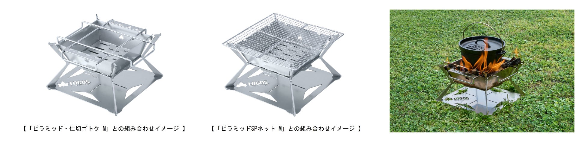 別売りの「ピラミッド・仕切りゴトク M」や「ピラミッドSPネット M」と組み合わせて使えば、BBQや鍋調理など、様々なアウトドア調理を楽しむことができます。
