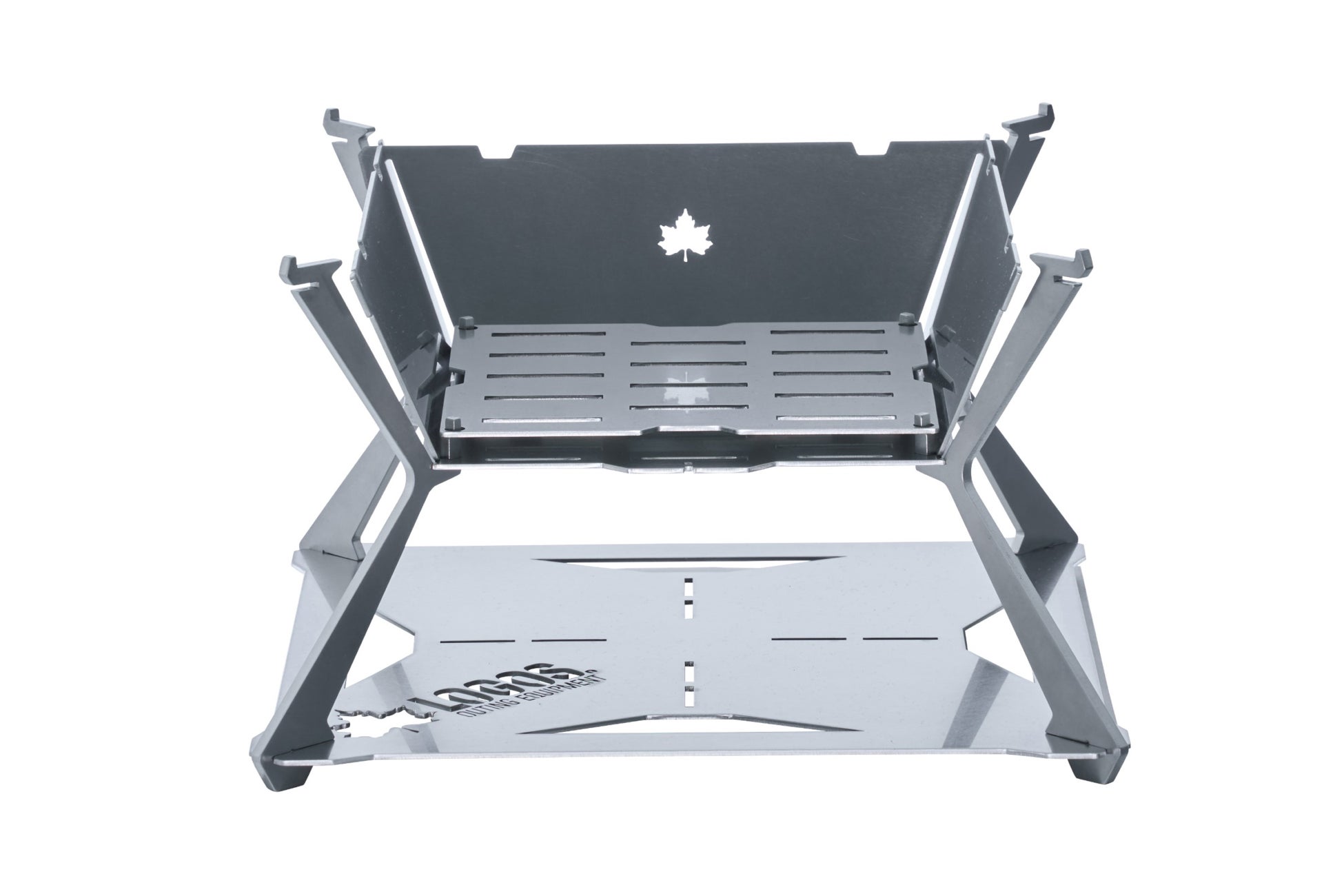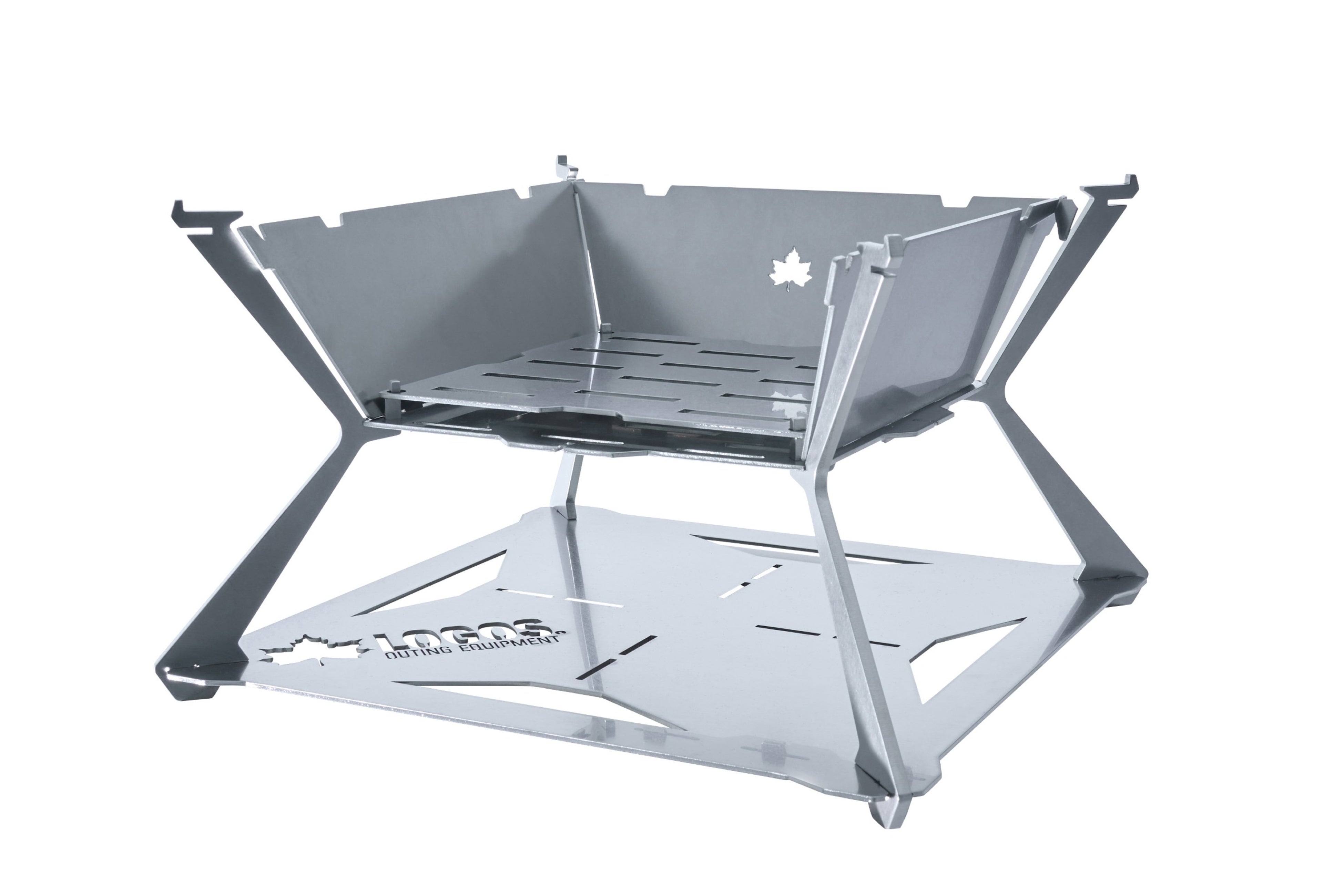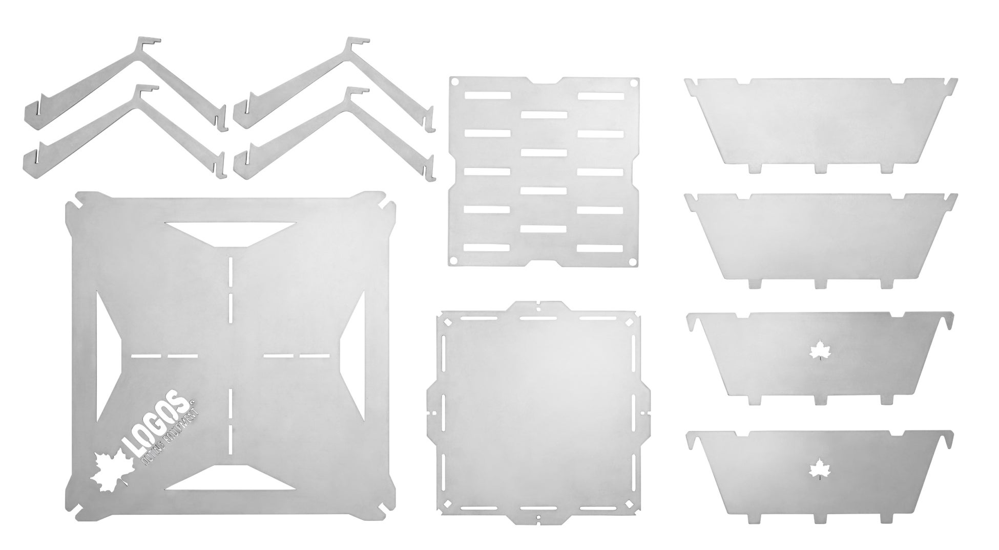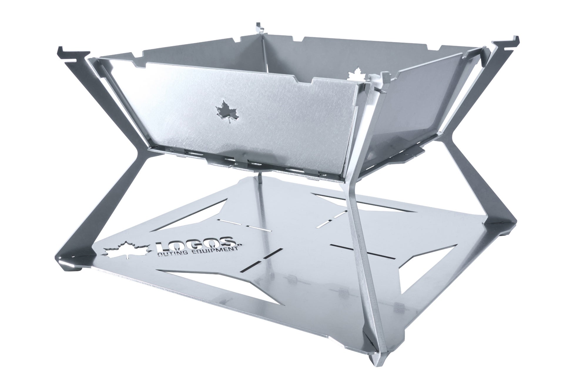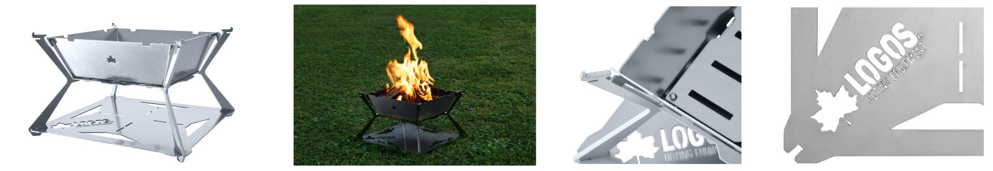 差し込み型のパーツは1面を外した3面の状態でも使用可能で、大きな薪などもスムーズに出し入れできます。標準装備のロストル(燃料を置く網)により、燃料の下に空気の通り道を確保できるので、燃焼効率の最大化を実現します。また、日本製で精度の高いレザーカット技術により、厚みのあるステンレスパーツにもLOGOSのロゴを施したこだわりのデザインです。
