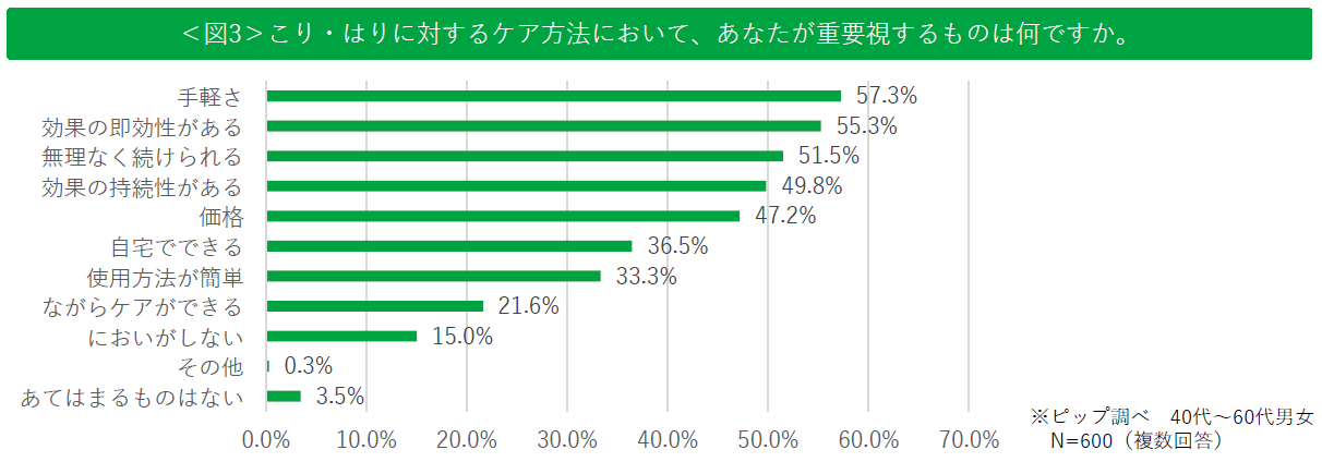 ✓こり・はりに対するケア方法において、「手軽さ(57.3%)」「効果の即効性(55.3%)」