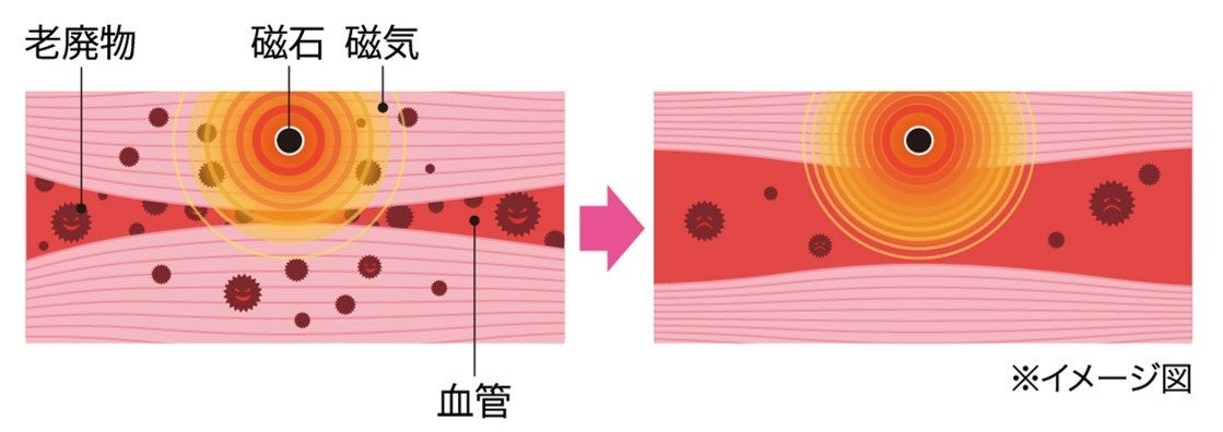 磁気が体内成分に働きかけて筋肉内の血行を良くし、老廃物を流すことでこりをほぐします。磁気は、着けた瞬間からコリのある部分に作用し始めます。ヒリヒリ感やひんやり感といった皮膚への刺激はありません。刺激を感じることと効きめとは異なります。