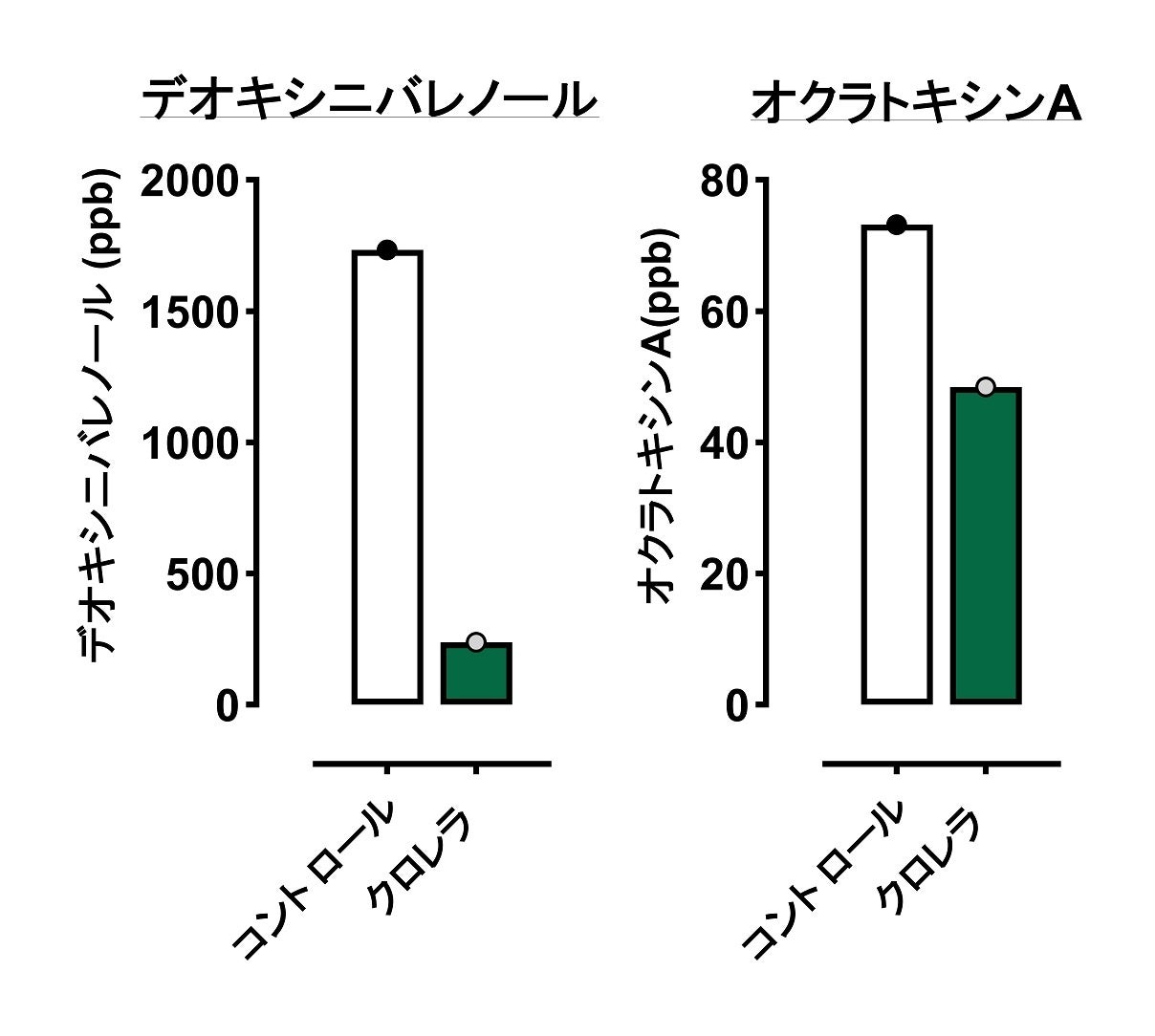 これまでの研究において、微細藻類の一種であるクロレラの摂取が、鉛、メチル水銀、カドミウム等の重金属に対して、排出促進、解毒作用をもつことが報告されているほか、マイコトキシンの一種であるアフラトキシンに対しても吸収抑制作用があることが、ヒトやウズラの試験で示唆されています。今回は、ヤエヤマクロレラの摂取によるデオキシニバレノールおよびオクラトキシンAに対する毒素排出効果について検証を行いました。