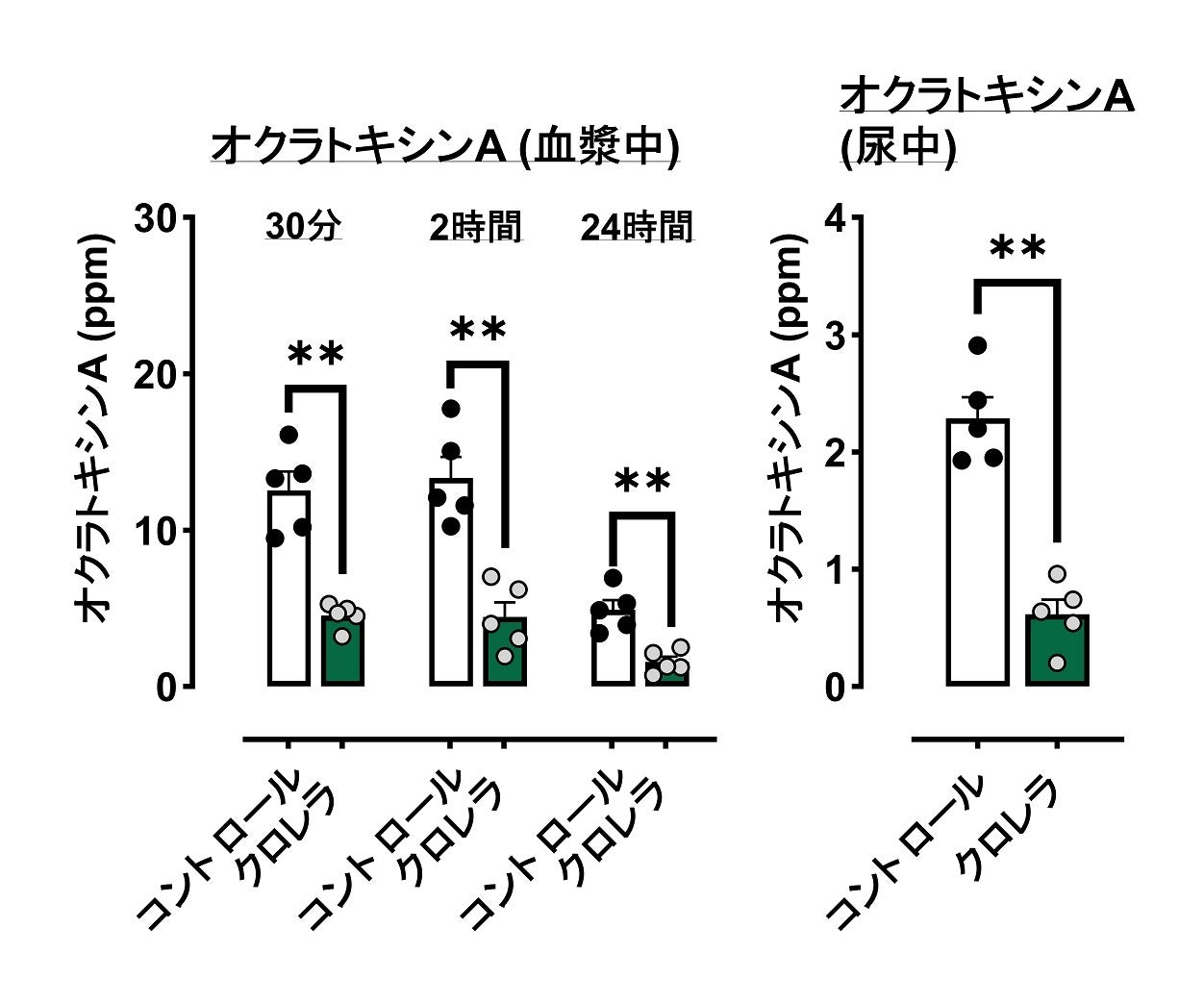①ヤエヤマクロレラの摂取が、血漿および尿中のマイコトキシンを排出することが示唆されました