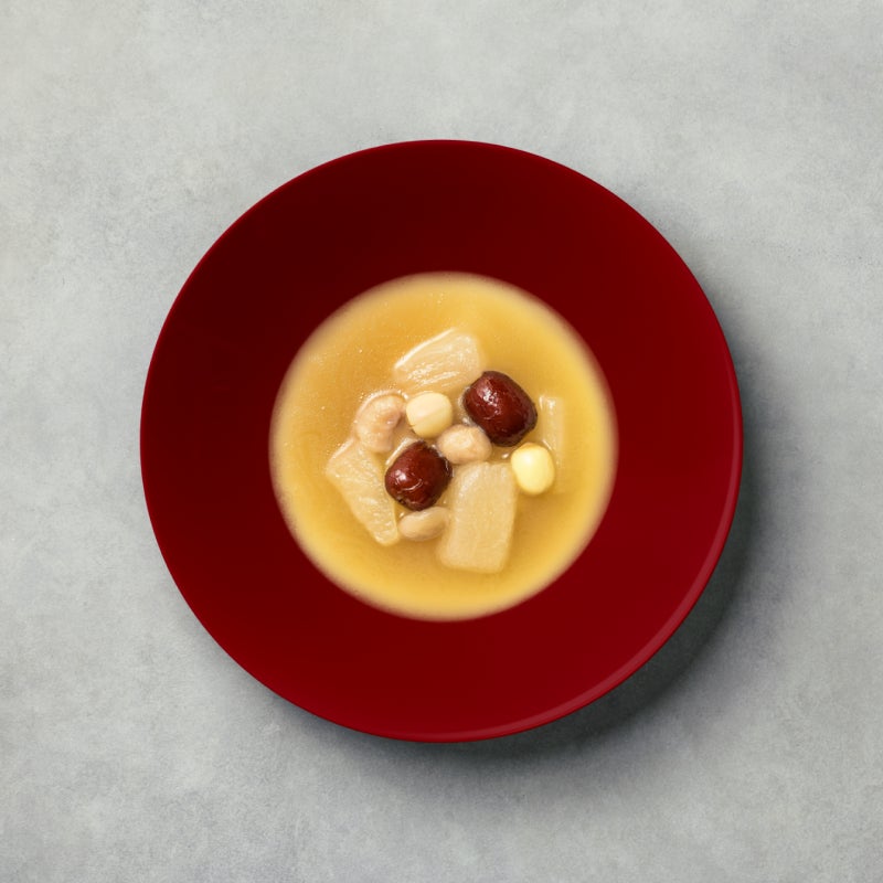 冬瓜、ナツメ、龍眼肉、蓮の実と薬膳にも使われる、食材を使用した、体に優しいスープです。 味付けはシンプルな鶏ガラスープで、それぞれの具材は大きくカットし、 スープのうまみは感じながらも素材本来の味や香りも同時に楽しんでいただけます。 ほっと一息つきたいときにおすすめな、からだに沁みるスープです。