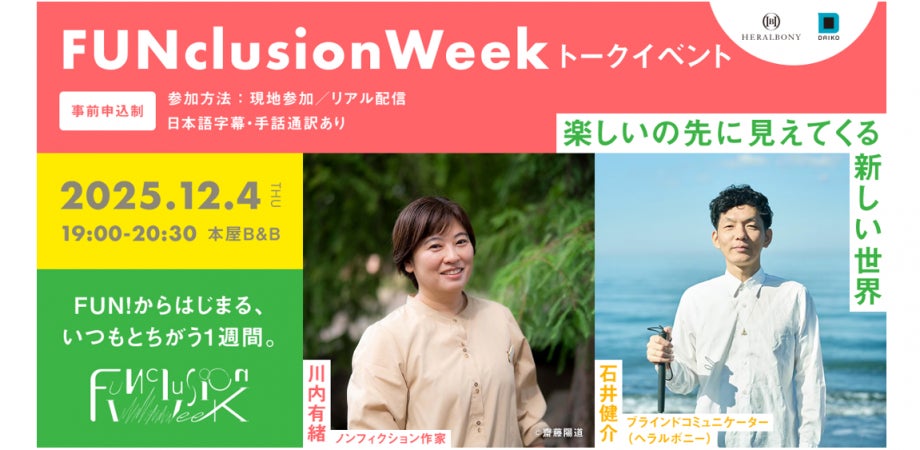 ベストセラー書籍「目の見えない白鳥さんとアートを見に行く」の著者である川内有緒さんとブラインド・コミュニケーター石井健介さんが出演するトークイベント。FUNclusion Weekの見どころはもちろん、会場内で雑談型アート鑑賞も行いながら、楽しいから見えてくる新しい世界について語ります。